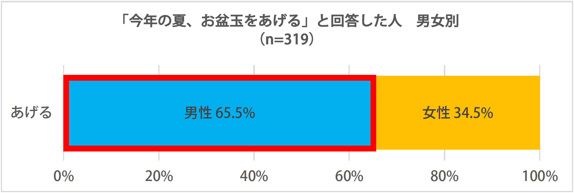 そのうち「知っている」と回答した1,339名に「今年の夏、お盆玉をあげるか」と質問したところ、「あげる」と回答した人は23.8%だった。年代別で見ると最多が20代29.5%、次いで30代27.9%で、それ以外の年代は1割程度だった。さらに男女別で見ると男性が65.5%、女性が34.5%と、今年の夏にお盆玉をあげる予定があるのは男性の方が多いことがわかった。