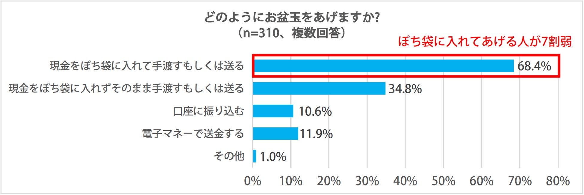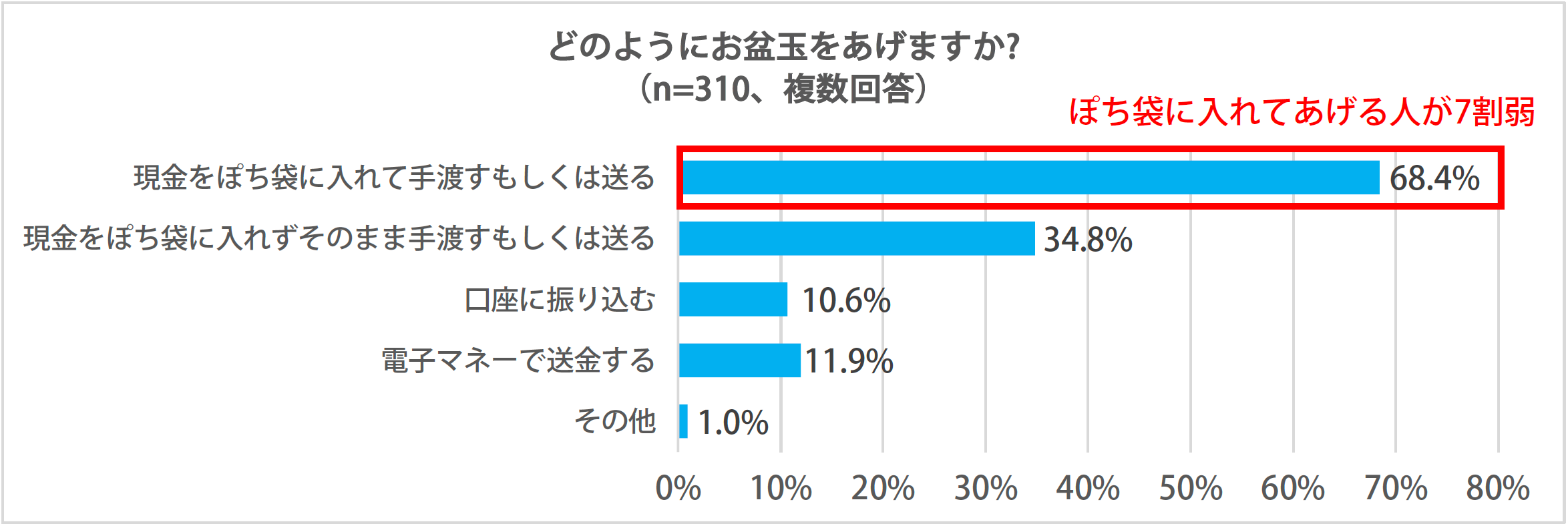 また、「どのようにお盆玉をあげるか」と質問したところ、最多が「現金をぽち袋に入れて手渡すもしくは送る」68.4%だった。現金以外は1割程度で、「口座に振り込む」10.6%、「電子マネーで送金する」11.9%だった。