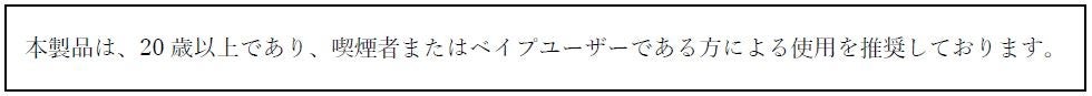 BATグループでは、たばこ製品のマーケティングを適切に実施するために国際的な自主規準を設定しています。そのためベイプ製品に関しても、弊社としては、責任あるマーケティング活動の精神に則り、本製品は20歳以上であり、喫煙者またはベイプユーザーである方による使用を推奨しております。記事掲載していただく際には、「注意文言」が表示されるようご配慮いただきたく存じます。 ご協力の程、何卒よろしくお願い申し上げます。