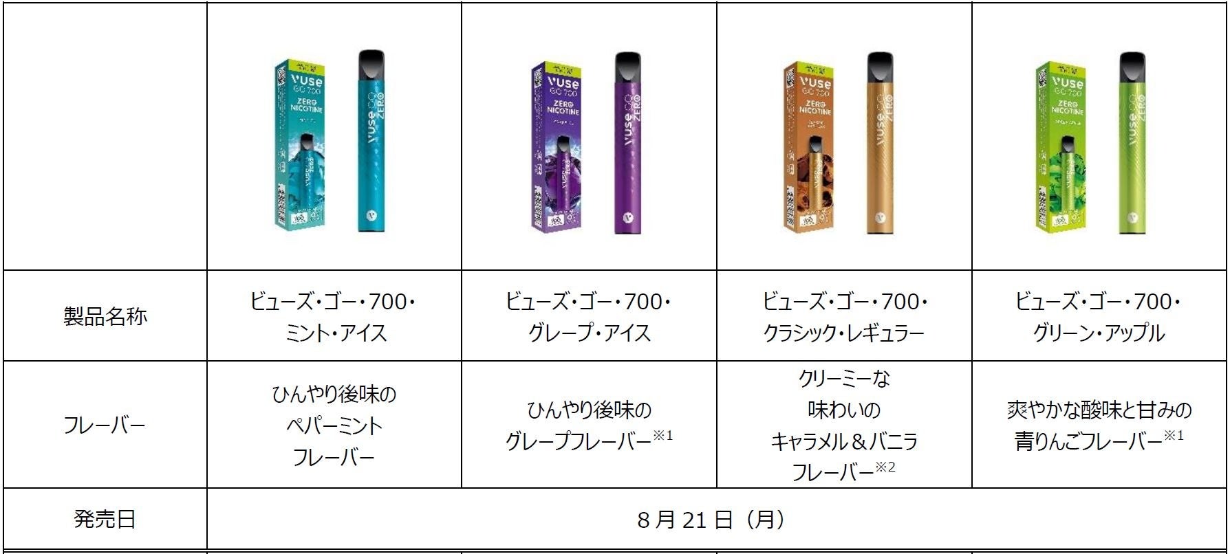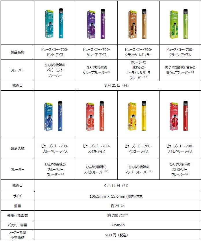 これらの好評な反響を受けて、テスト販売で頂戴したお客様の声を反映し、メーカー希望小売価格はそのままに、吸引回数や使用体験、使いやすさが強化されている新モデル「Vuse Go 700」を、より幅広いフレーバーの選択肢とともに提供します。1本あたりの吸引回数が約500回(※3)から約700回(※3)の1.4倍に増加しているほか、人間工学に基づいた設計の新型マウスピースを採用し、満足度の高い吸い心地をお楽しみいただけます。また、テスト販売時は4銘柄だったフレーバーラインナップを2倍の合計8種類に拡充します。全8銘柄の内、4銘柄(※4)を8月21日(月)より、残り4銘柄(※5)を9月11日(月)より発売します。