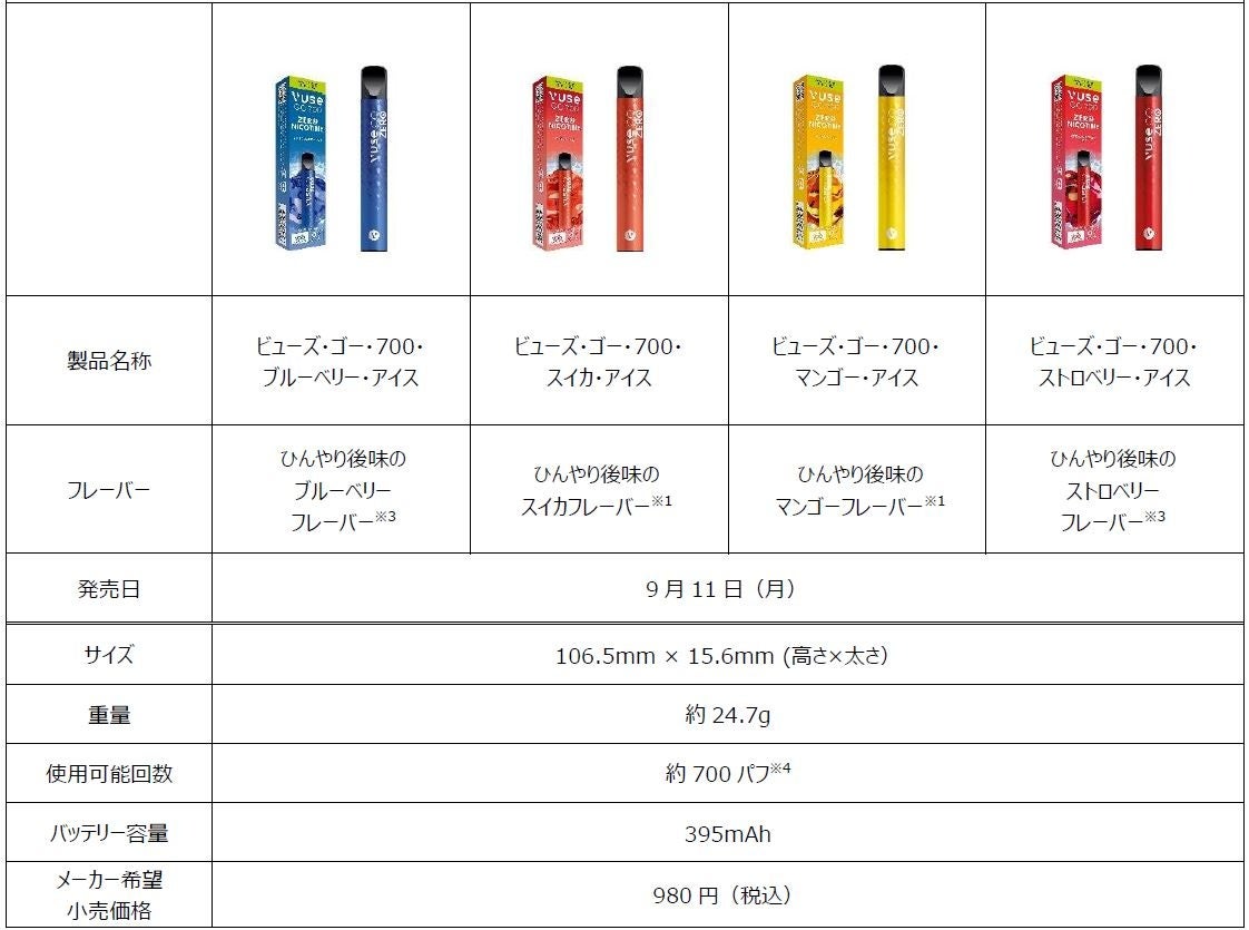*9月11日(月)より販売する、「ビューズ・ゴー・700・ブルーベリー・アイス」、「ビューズ・ゴー・700・スイカ・アイス」、「ビューズ・ゴー・700・マンゴー・アイス」、「ビューズ・ゴー・700・ストロベリー・アイス」の製品ページは、後日Vuse公式ウェブサイトにてお知らせいたします。