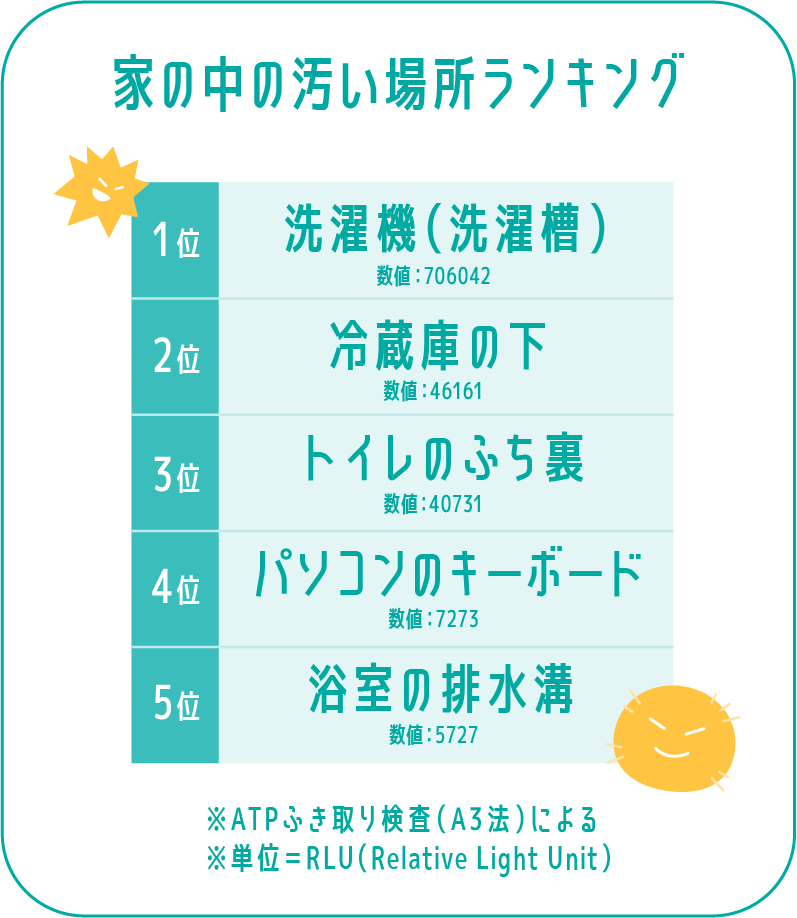 一般社団法人 日本洗濯機クリーニング協会が行ったATP検査*で、洗濯機・トイレ・お風呂の排水溝・キッチンの排水溝では、どこが1番汚れているかを調査しました。その結果、なんと洗濯機が特に汚いという結果に。トイレや排水溝の方が汚れていると思われがちですが、実は洗濯槽がもっとも汚れているのです。