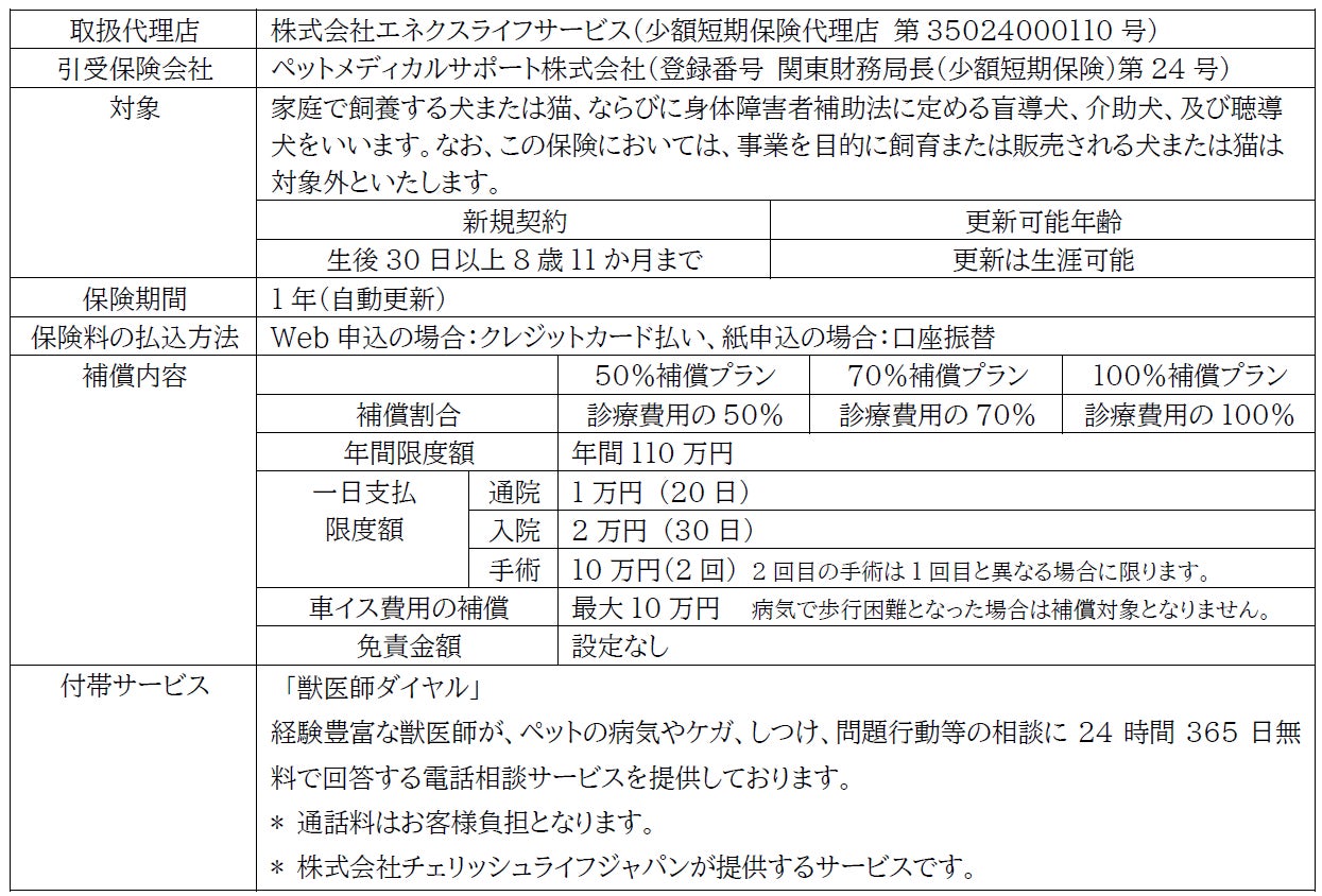 伊藤忠エネクス株式会社(本社:東京都千代田区、代表取締役社長:田畑信幸、以下「伊藤忠エネクス」)のグループ会社である株式会社エネクスライフサービス(本社:東京都千代田区、代表取締役社長:加藤繁道、以下「ELS」)は、ペットメディカルサポート株式会社(本社:東京都港区、代表取締役:米満明仁、以下「PS保険」)と代理店契約を締結し、2025年11月12日より、ペット保険「TERASELペットほけん」(以下「本サービス」)の提供を開始いたしました。