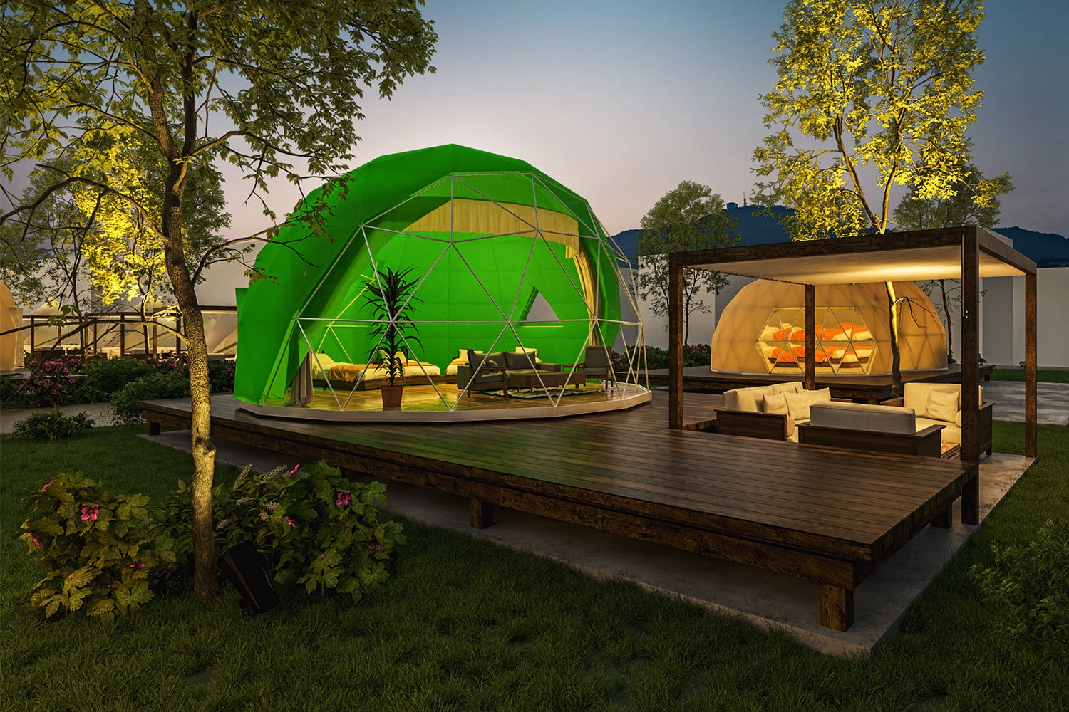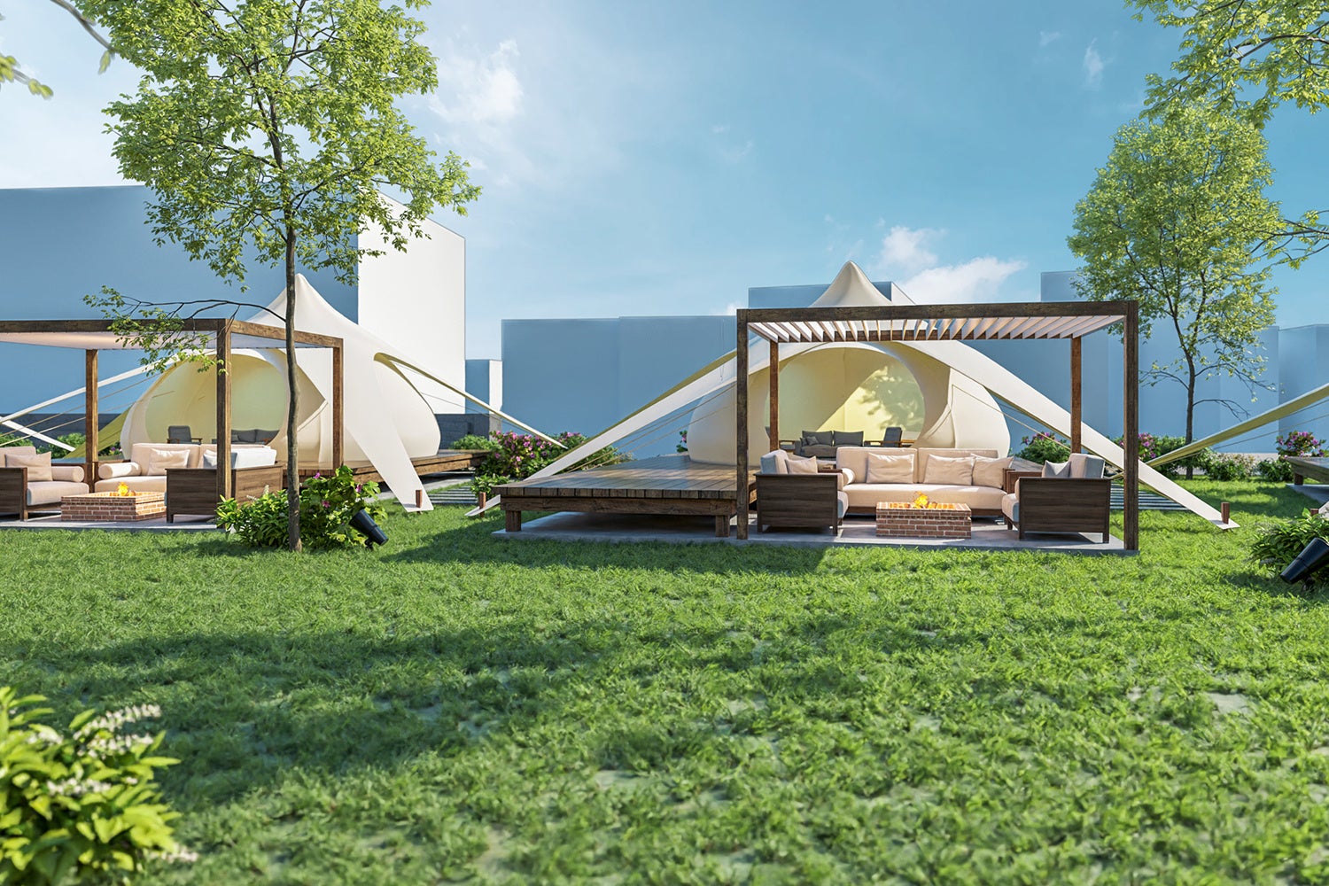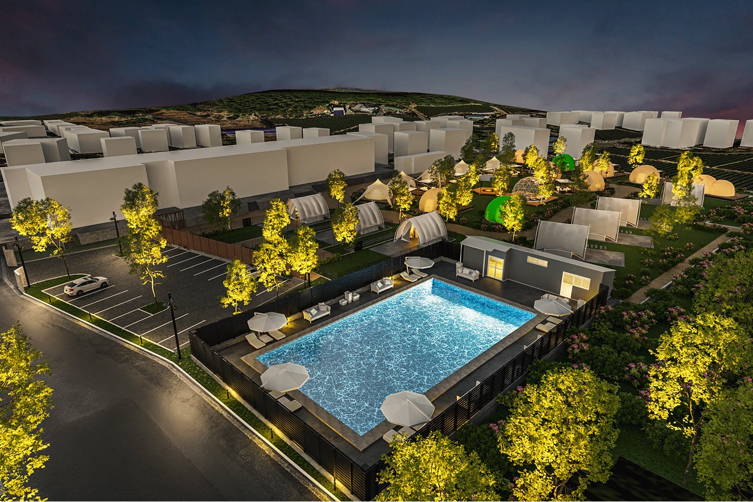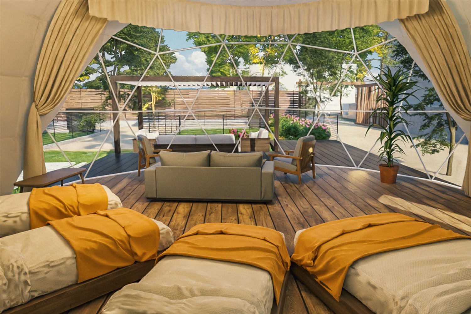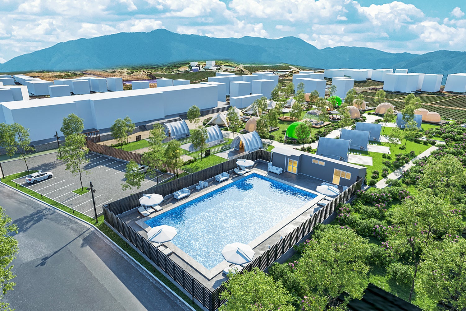 全21棟と大型テントを配置したグランピング施設「Glamping&Port結」がオープン。