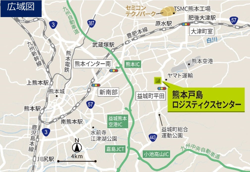 当該地は、九州で3番目に人口の多い熊本市の中心部から東へ約10kmの場所に位置し、九州地方の南北を結ぶ九州縦貫自動車道「益城熊本空港IC」から約5.5km、「熊本IC」から約8.8kmと交通利便性の高い場所に位置しています。また、半導体関連工場の集積地である菊陽町・大津町・合志市にも近接しており、物流施設の立地として高いポテンシャルを有しています。