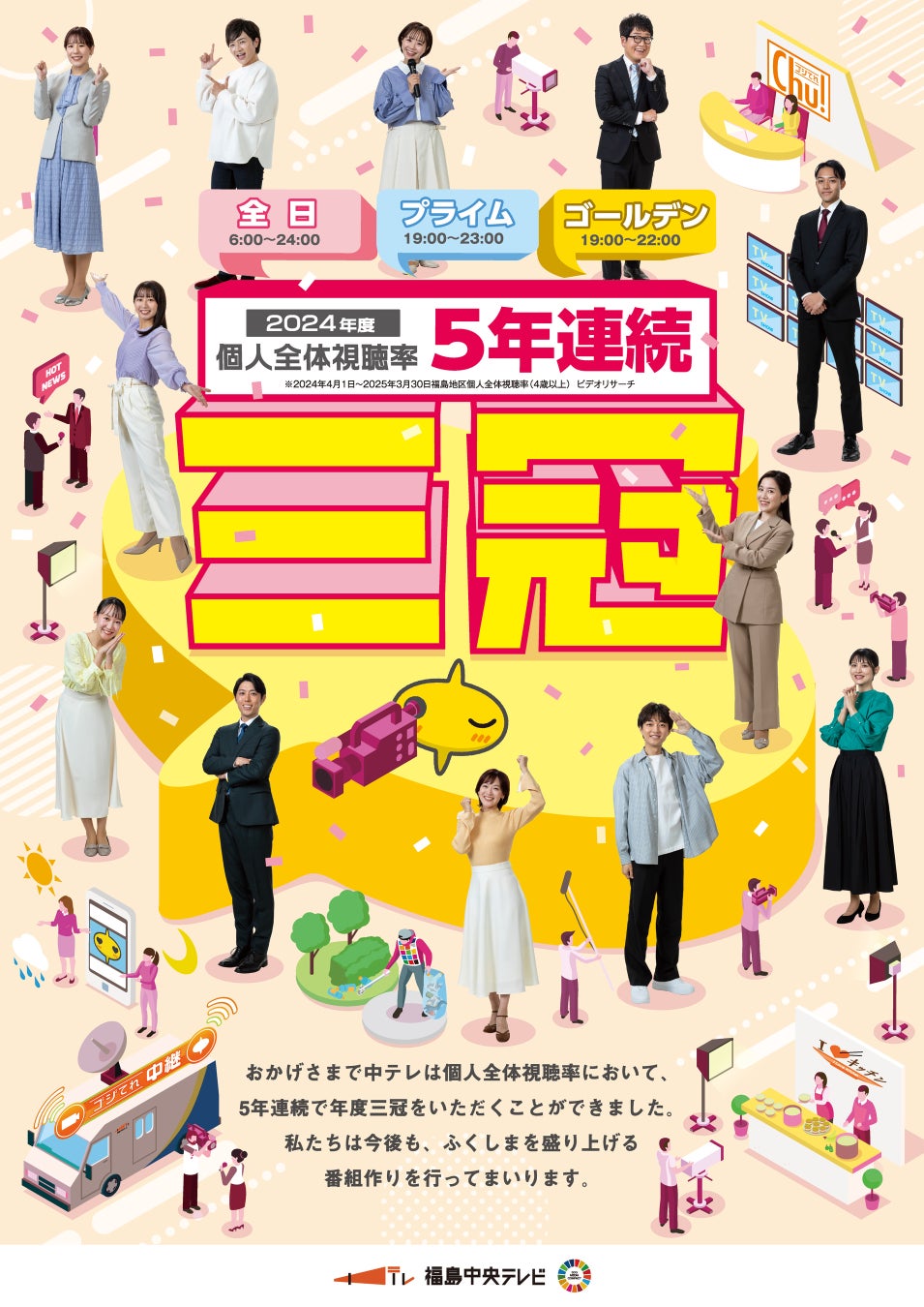福島中央テレビの年度個⼈全体視聴率での三冠は NHK を含む県内のテレビ局 5 局⽐較で 5年連続となります。