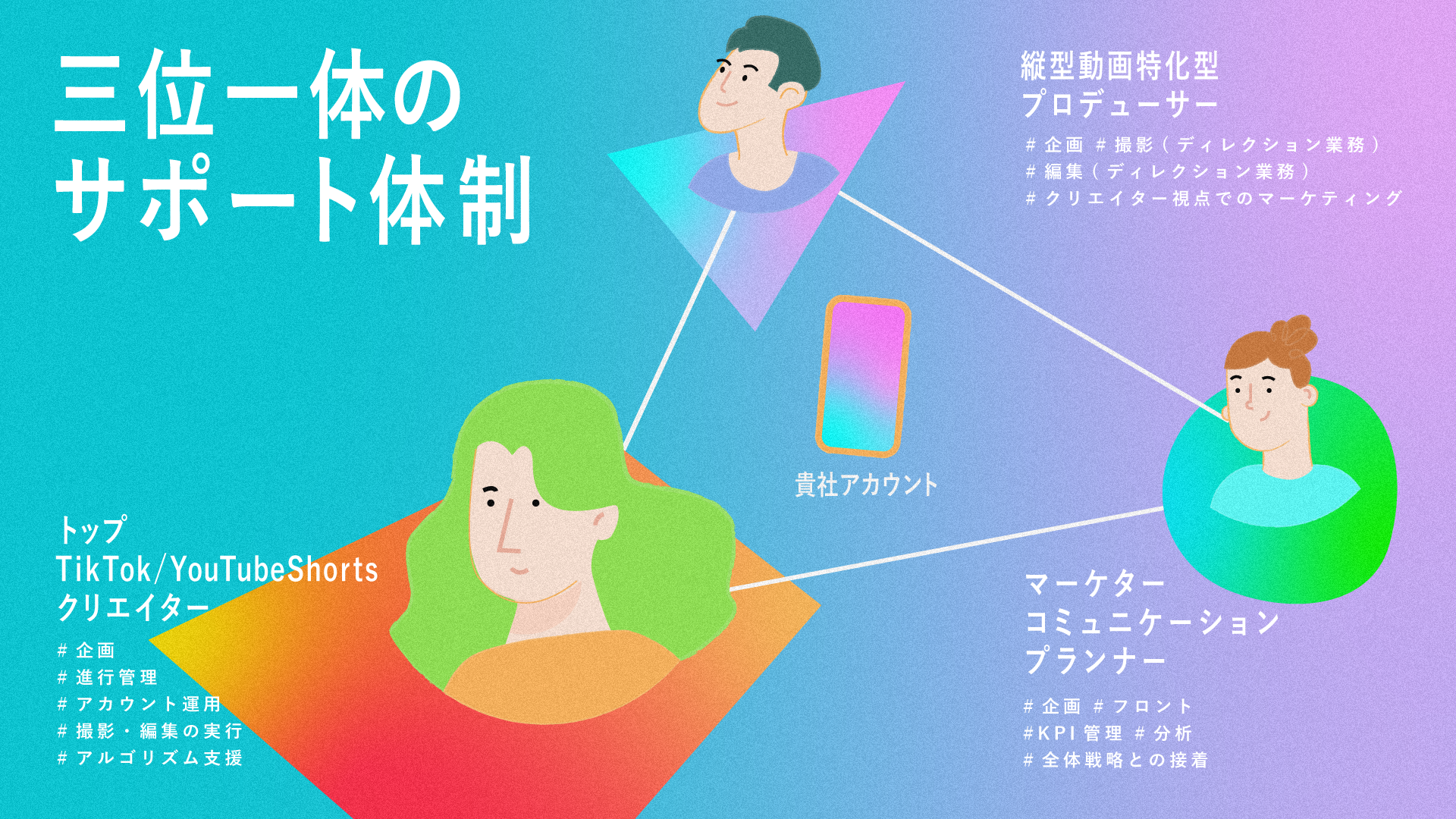 縦型動画メディアのトップインフルエンサー・広告プランナー・縦型動画に特化したプロデューサーによる三位一体のサポート体制を実現することで、スピードと品質を両立した企業の縦型動画の効果的な制作・活用を全面的にサポートしてまいります。
