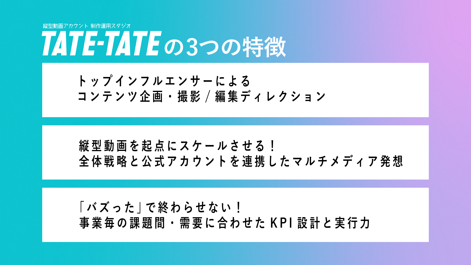 このような背景から、アイレップはTikTokを中心とした縦型動画に特化したクリエイティブ制作に強みをもつOASIZと連携し、企業のマーケティング活動における短尺縦型動画の活用支援を加速させマーケティング効果最大化を実現すべく、企業の縦型動画アカウントの制作運用スタジオ「TATE – TATE(タテタテ)」を提供いたします。