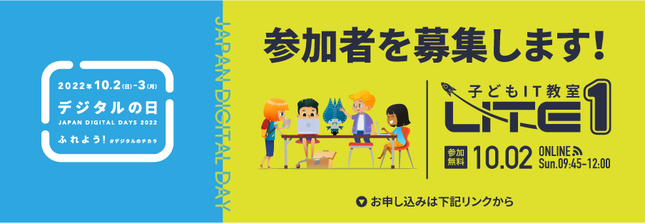 当社のサステナビリティ活動の一環として実施してきた子ども向けプログラミング教室「LITE1(ライトワン)」をデジタルの日スペシャルバージョンで開催。当日は当社の社員が先生役に配し、代表の田中も校長先生として登場します。皆様のご参加お待ちしています。