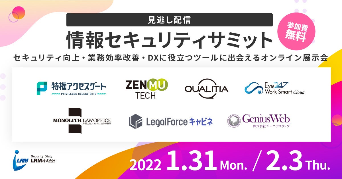LRM株式会社(以下 LRM、兵庫県神⼾市、代表取締役CEO 幸松哲也)は、2022年1月18日(火)15時~17時に、個人情報保護・情報セキュリティ向上・業務効率化・DXの推進に役立つツールを各社が紹介したり、個人情報保護に関する講演をおこなったりする無料オンライン展示会「情報セキュリティサミット」を開催したところ、多くの方にご視聴いただき、たくさんの反響をいただきました。その一方で「都合がつかず視聴できなかった」とのお声も多数いただいたことから、このたび1月31日(月)、2月3日(木)にサミットの様子を再配信する運びとなりました。