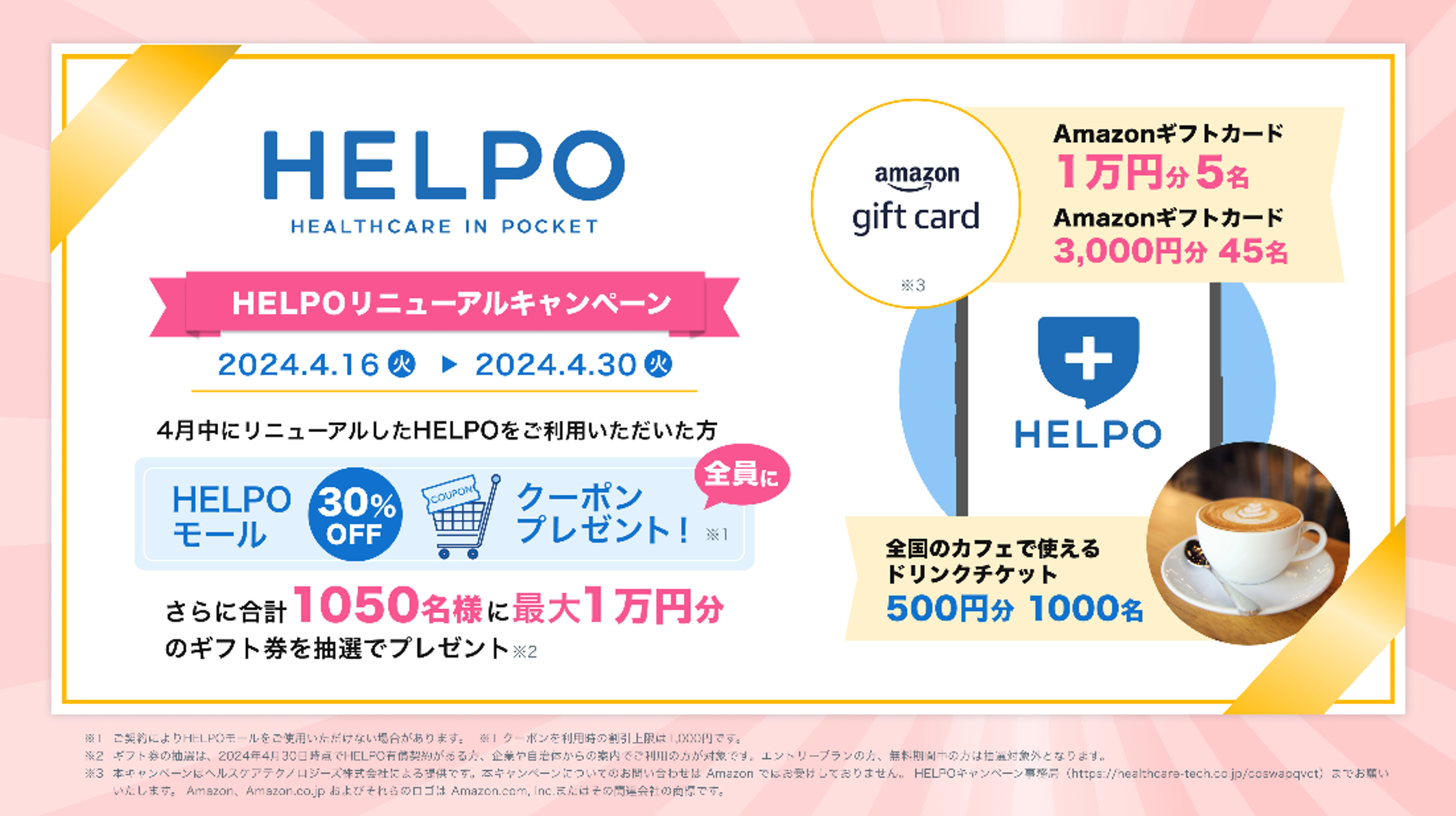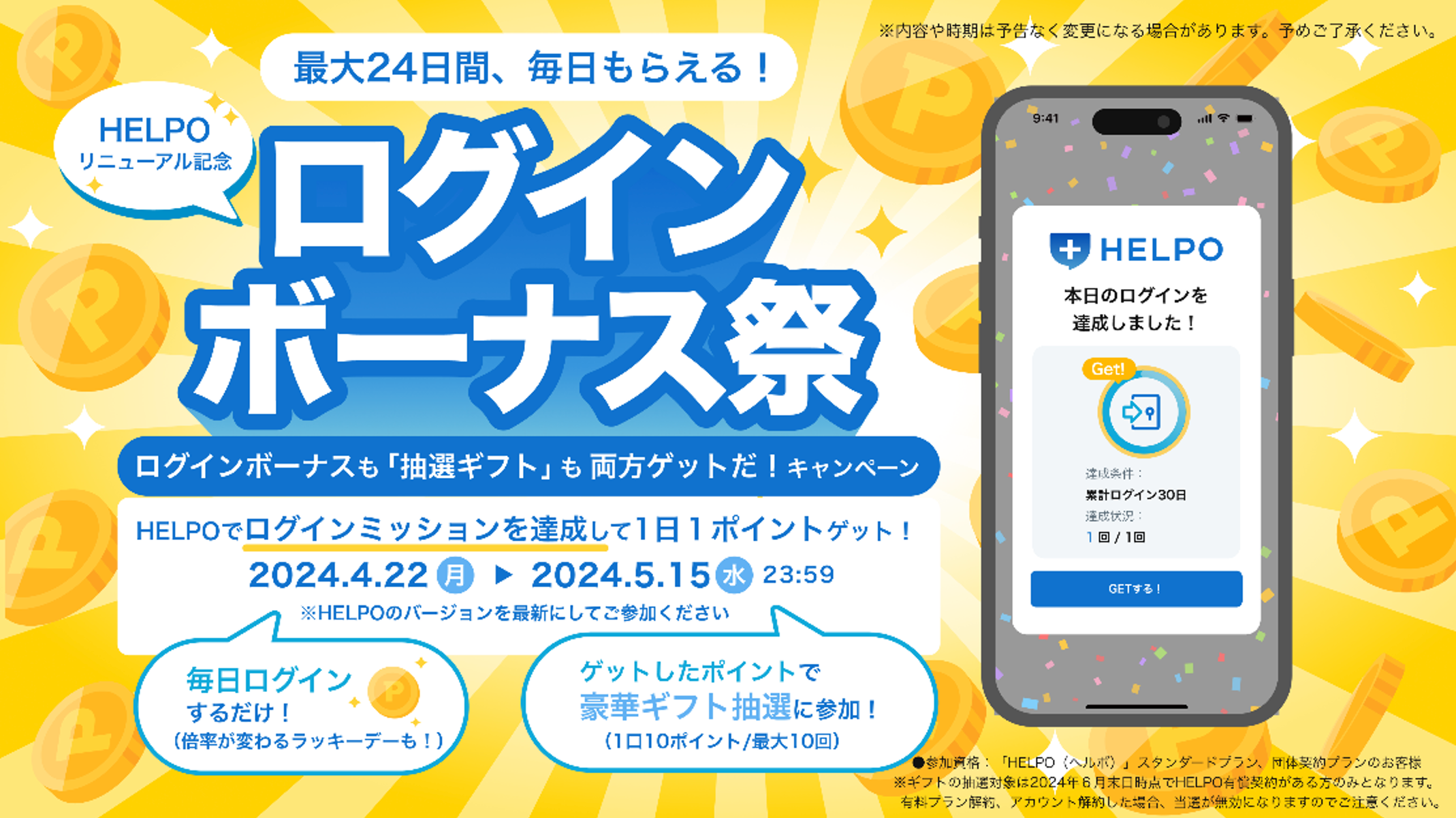 リニューアルを記念してAmazonギフトカードやドリンクチケットが当たる「HELPOリニューアルキャンペーン」を2024年4月16日~30日まで実施します。また、ログインミッションを達成することで、全員にポイントを付与する「ログインボーナス祭」を2024年4月22日~5月15日まで実施予定です。