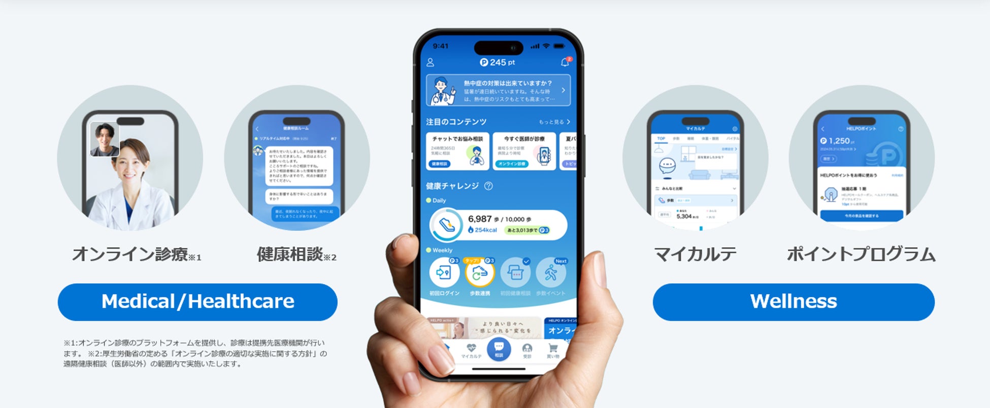 「HELPO」は2020年7月にサービスを開始し、24時間356日いつでも医療者に相談できる「健康医療相談」の提供、2021年6月には「オンライン診療」機能を追加するなど、法人や個人のお客さまに健康経営支援を行ってまいりました。