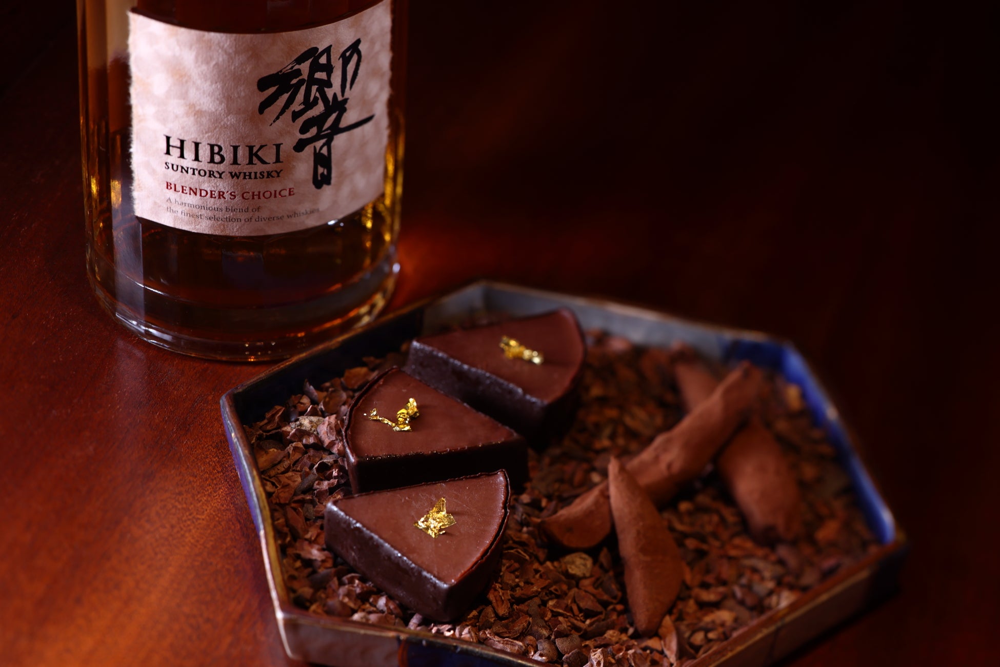 「響 BLENDER'S CHOICE」を贅沢に用い、ペストリーシェフが丁寧に仕上げた特製チョコレート。響の繊細な味わいと、上質なショコラの風味が重なり合うハーモニーが愉しめるテリーヌショコラをお愉しみください。