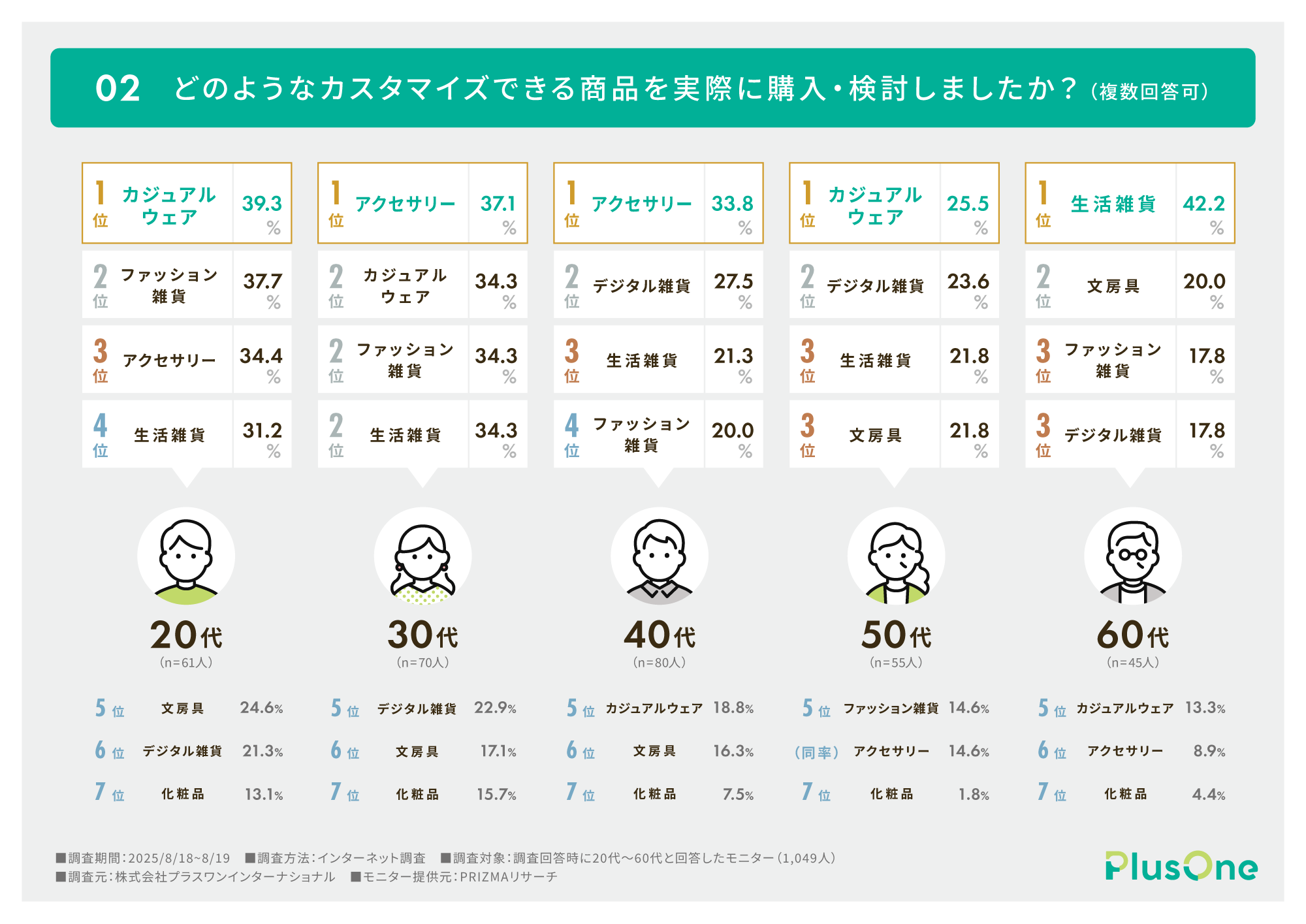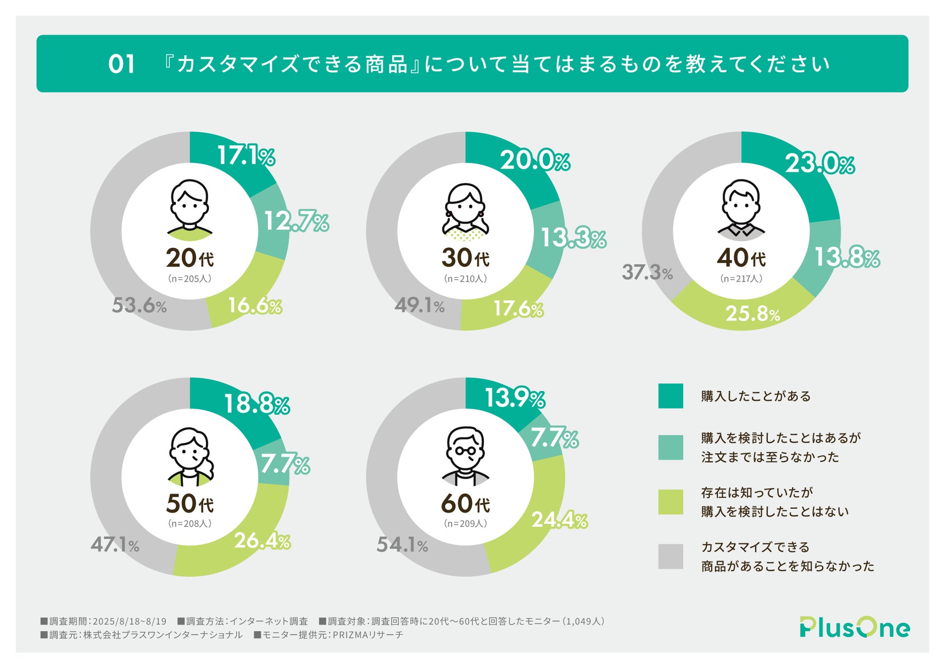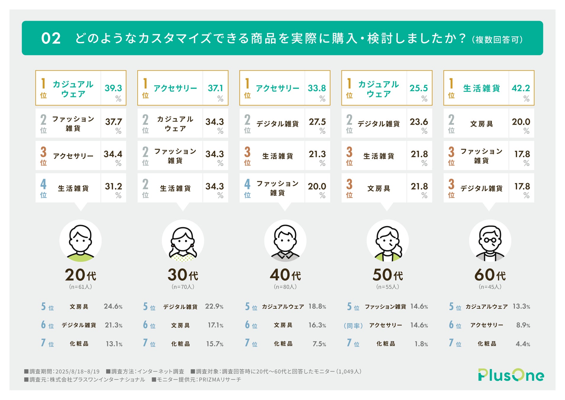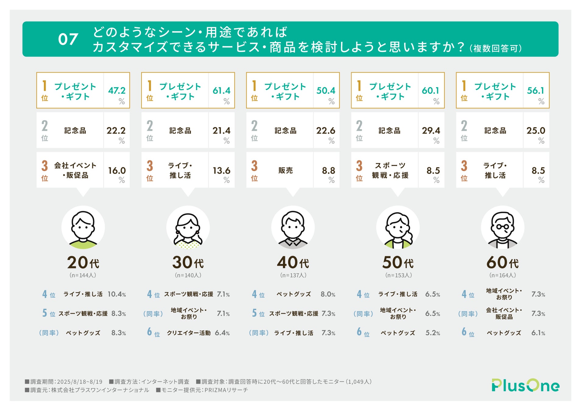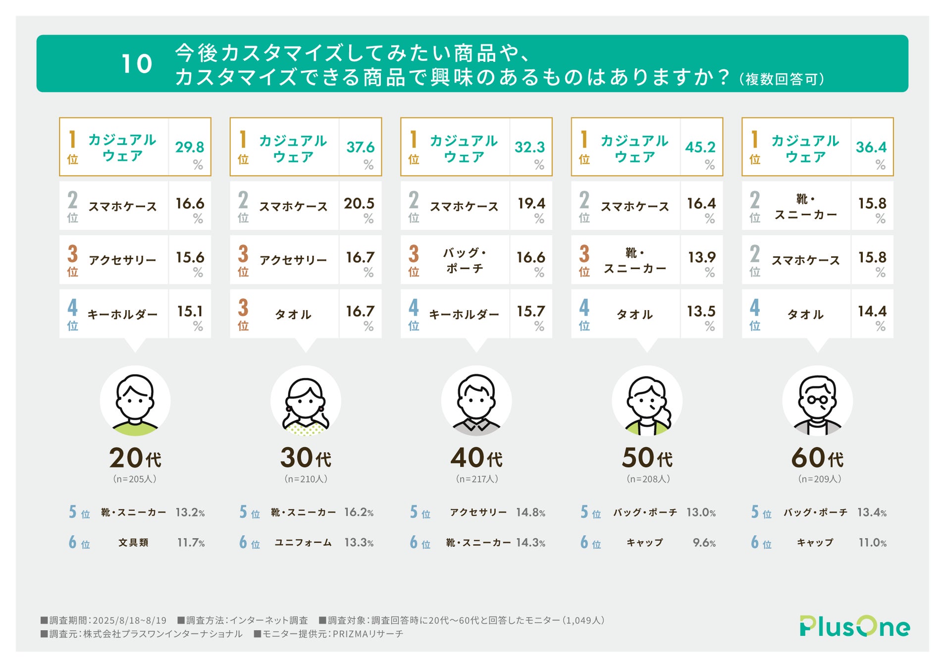 オリジナルウェア・グッズの製造販売を行う株式会社プラスワンインターナショナル(本社:香川県高松市、代表取締役:新開強、以下プラスワン)は、20代〜60代それぞれ200人を対象に「カスタマイズ商品」に関する調査を実施しました。