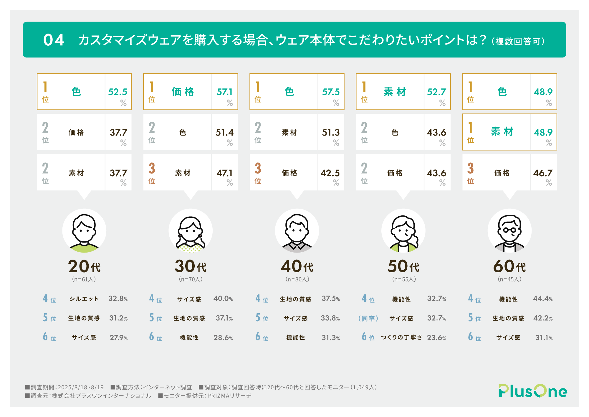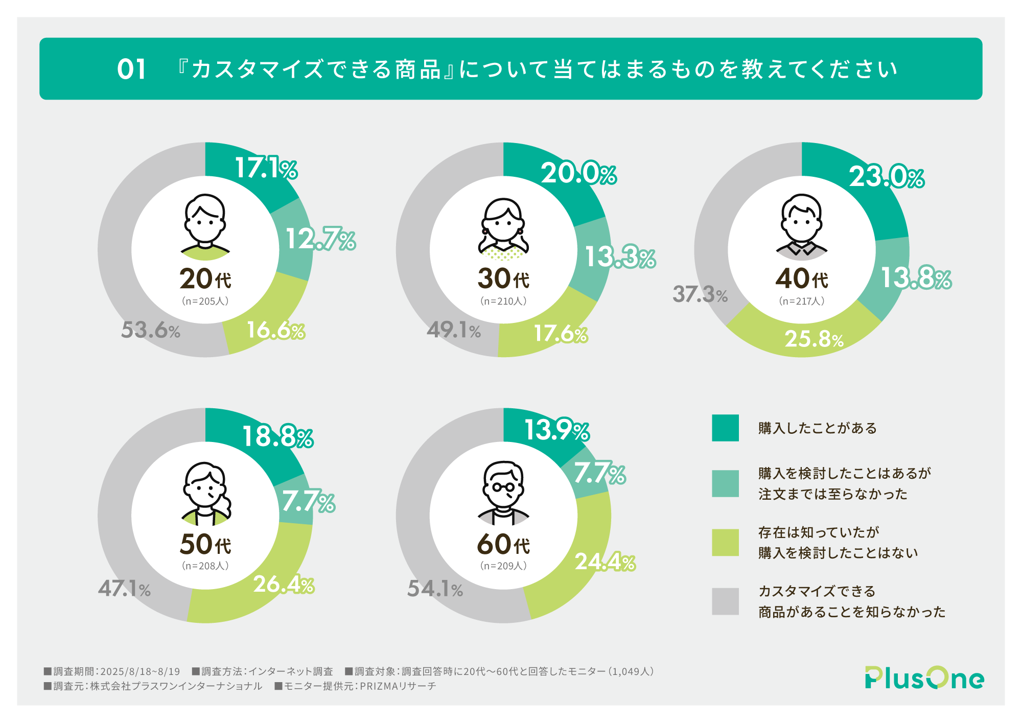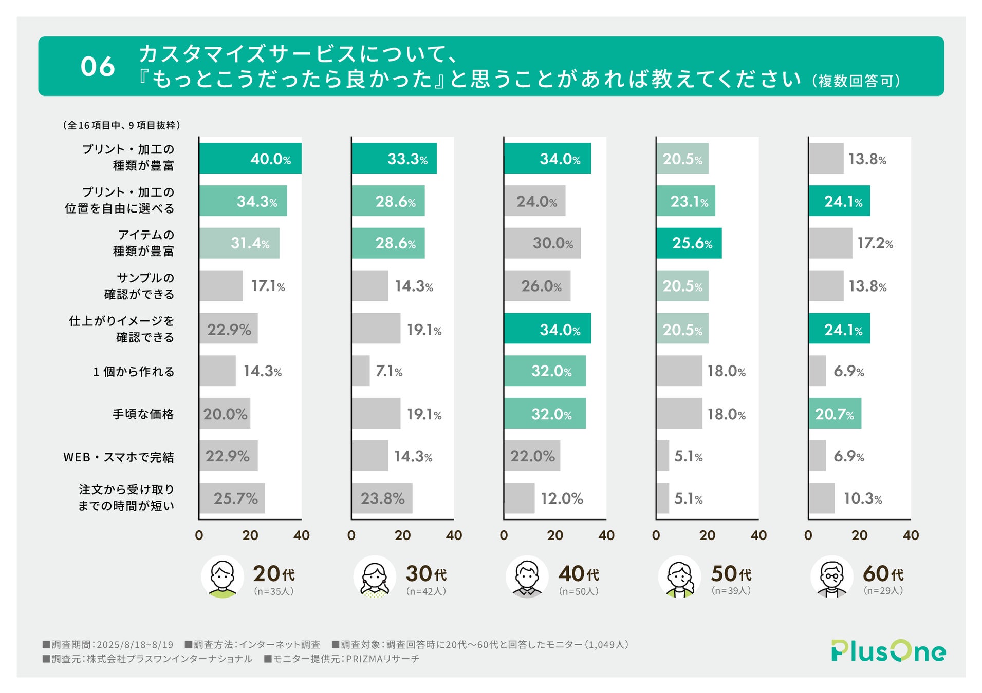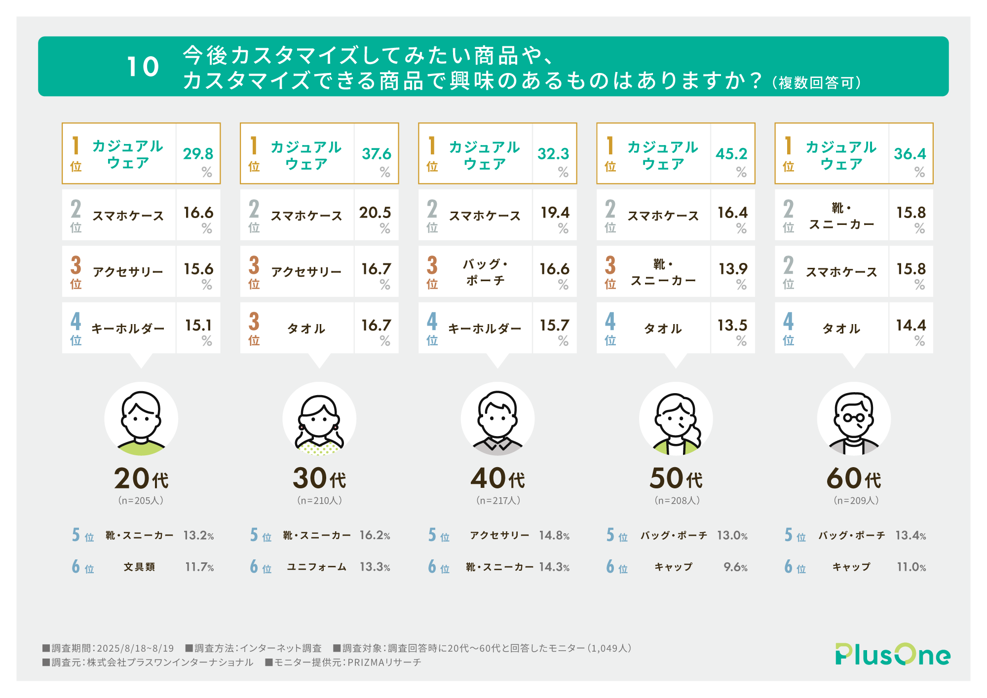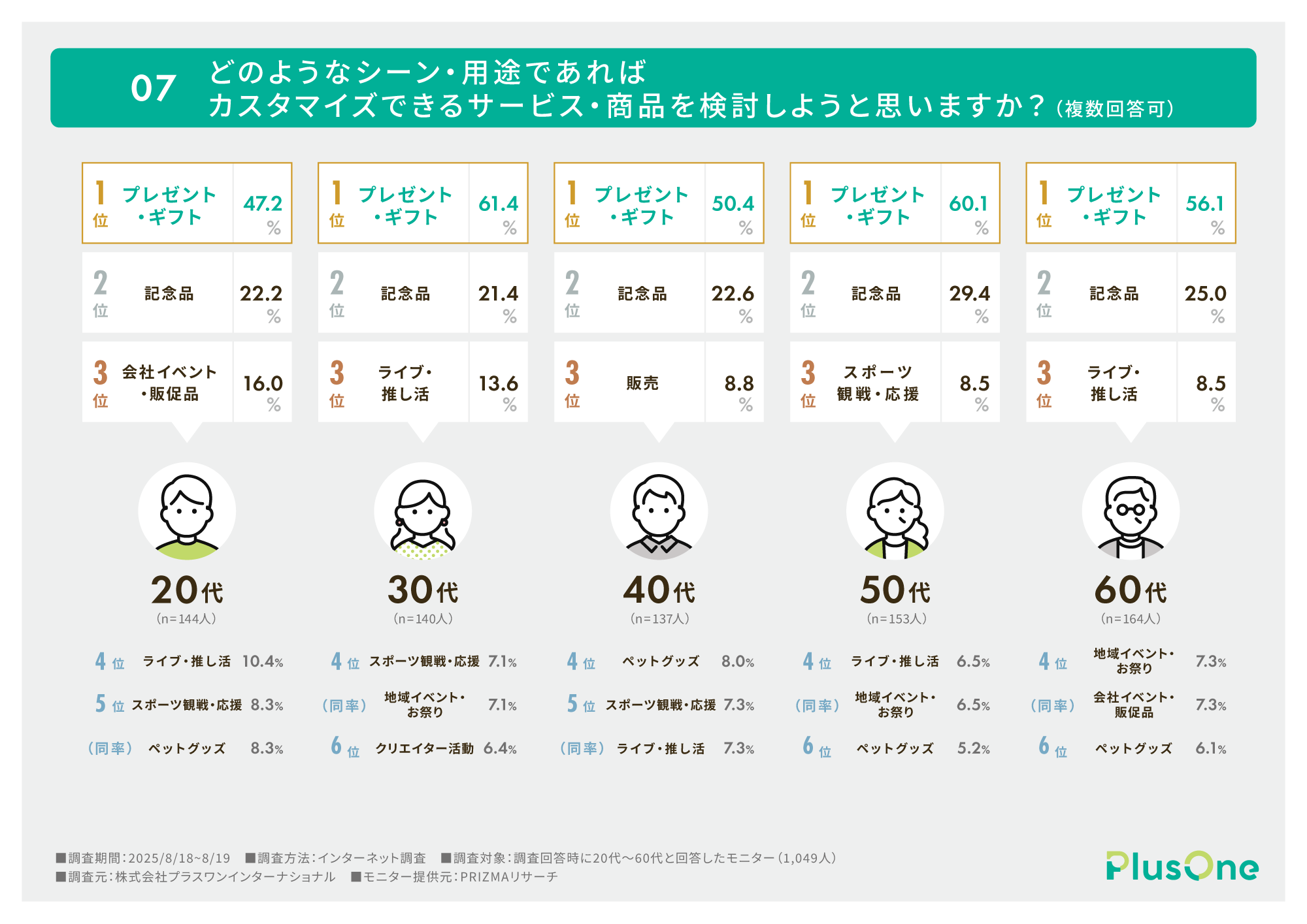 オリジナルウェア・グッズの製造販売を行う株式会社プラスワンインターナショナル(本社:香川県高松市、代表取締役:新開強、以下プラスワン)は、20代〜60代それぞれ200人を対象に「カスタマイズ商品」に関する調査を実施しました。