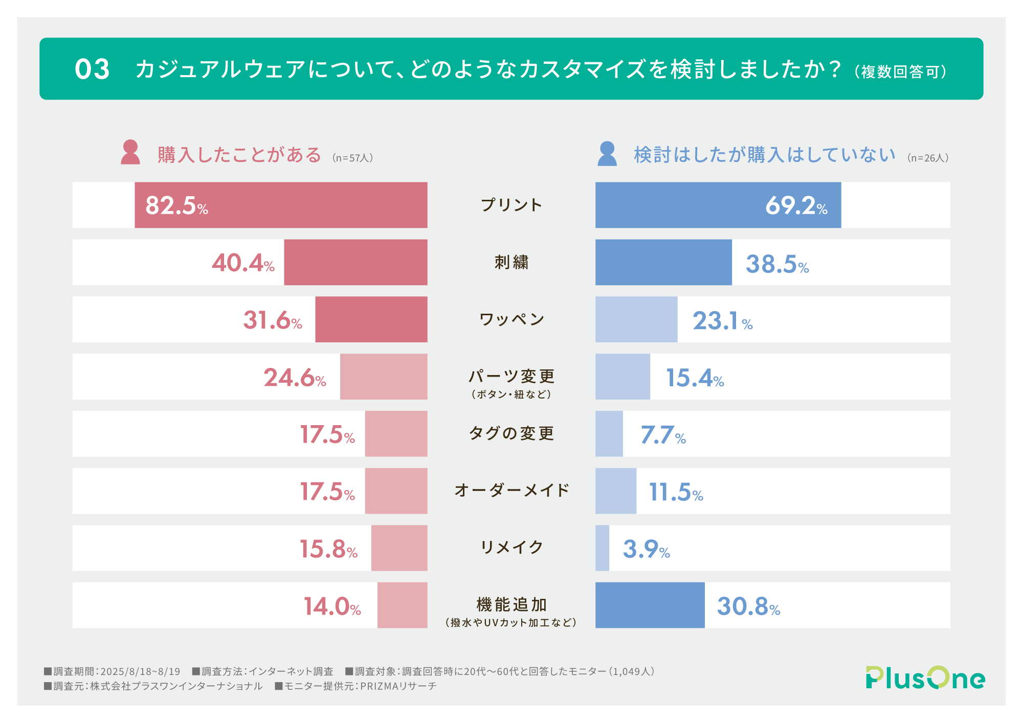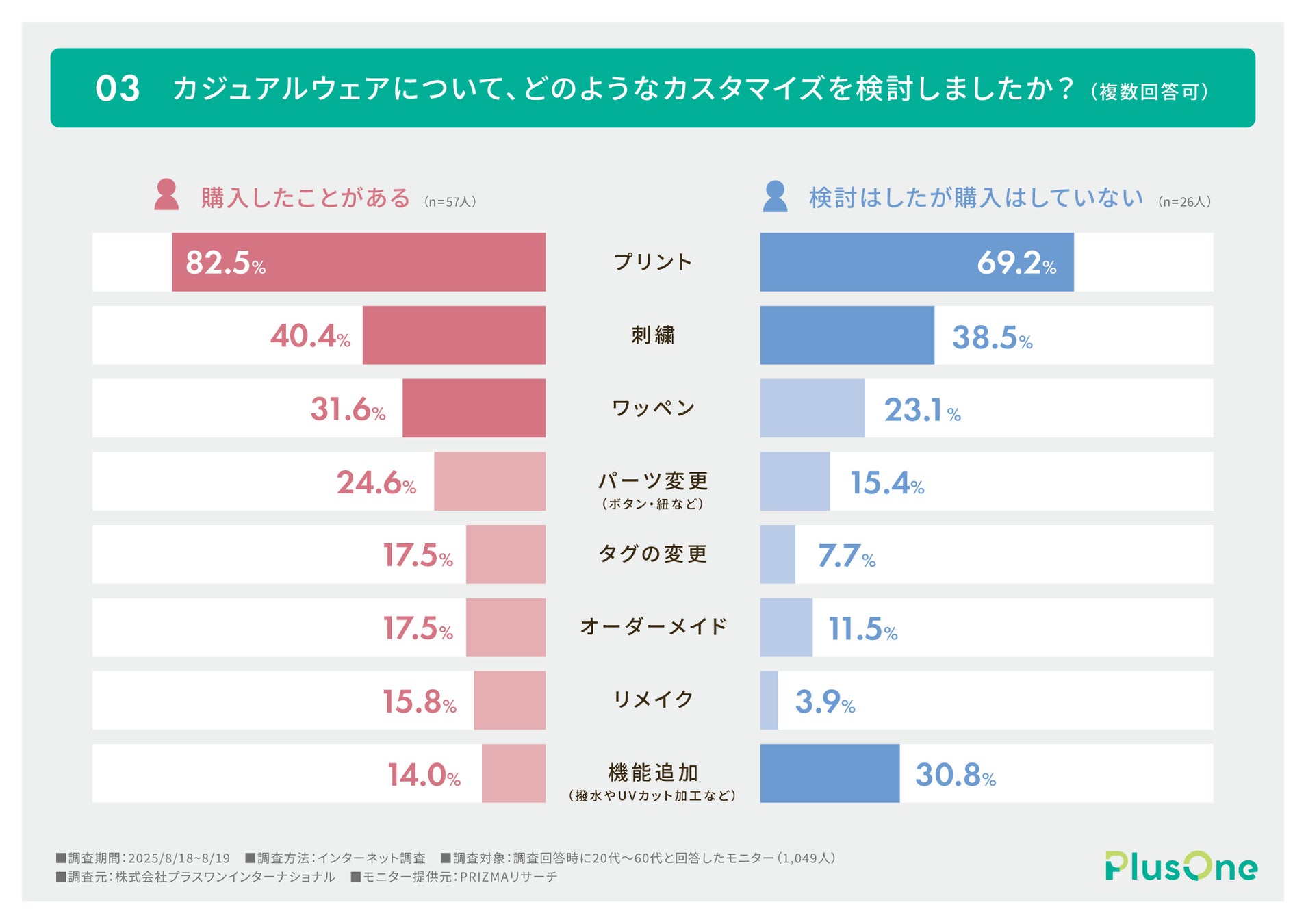 Tシャツやパーカーなどのカジュアルウェアのカスタマイズを経験・検討したことがある方を対象に、「どのようなカスタマイズを検討しましたか?」と質問したところ、『プリント』が最も多く、次いで『刺繍』となりました。