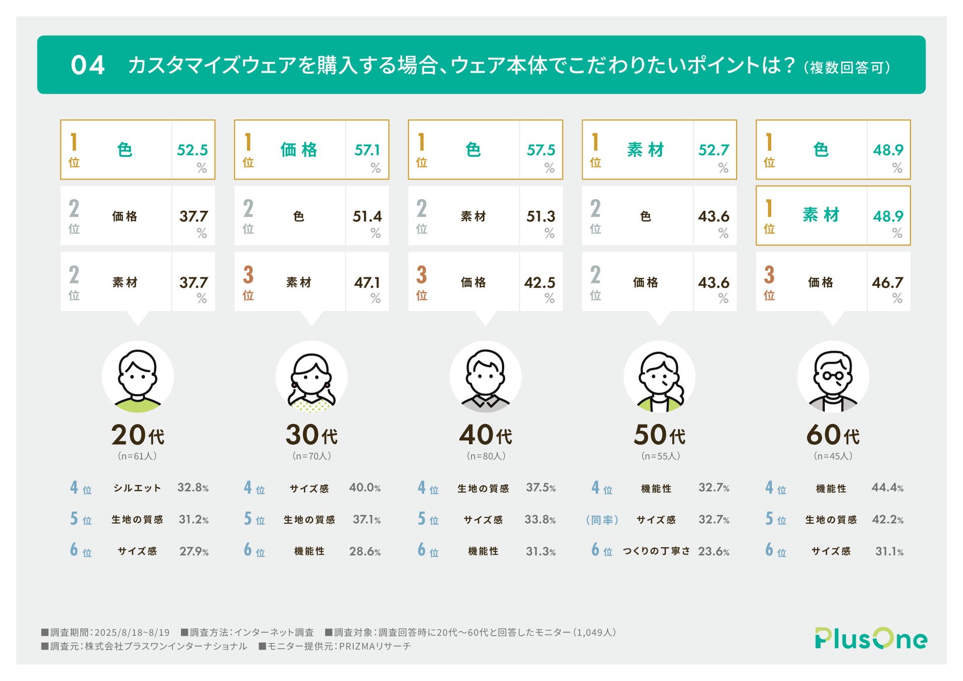 カスタマイズ商品を購入・検討したことがある方を対象に、「カスタマイズできるウェアを購入するとしたら、ウェア本体でこだわりたいポイントは何ですか?」と質問したところ、全年代で『色』『素材』『価格』が上位となりました。