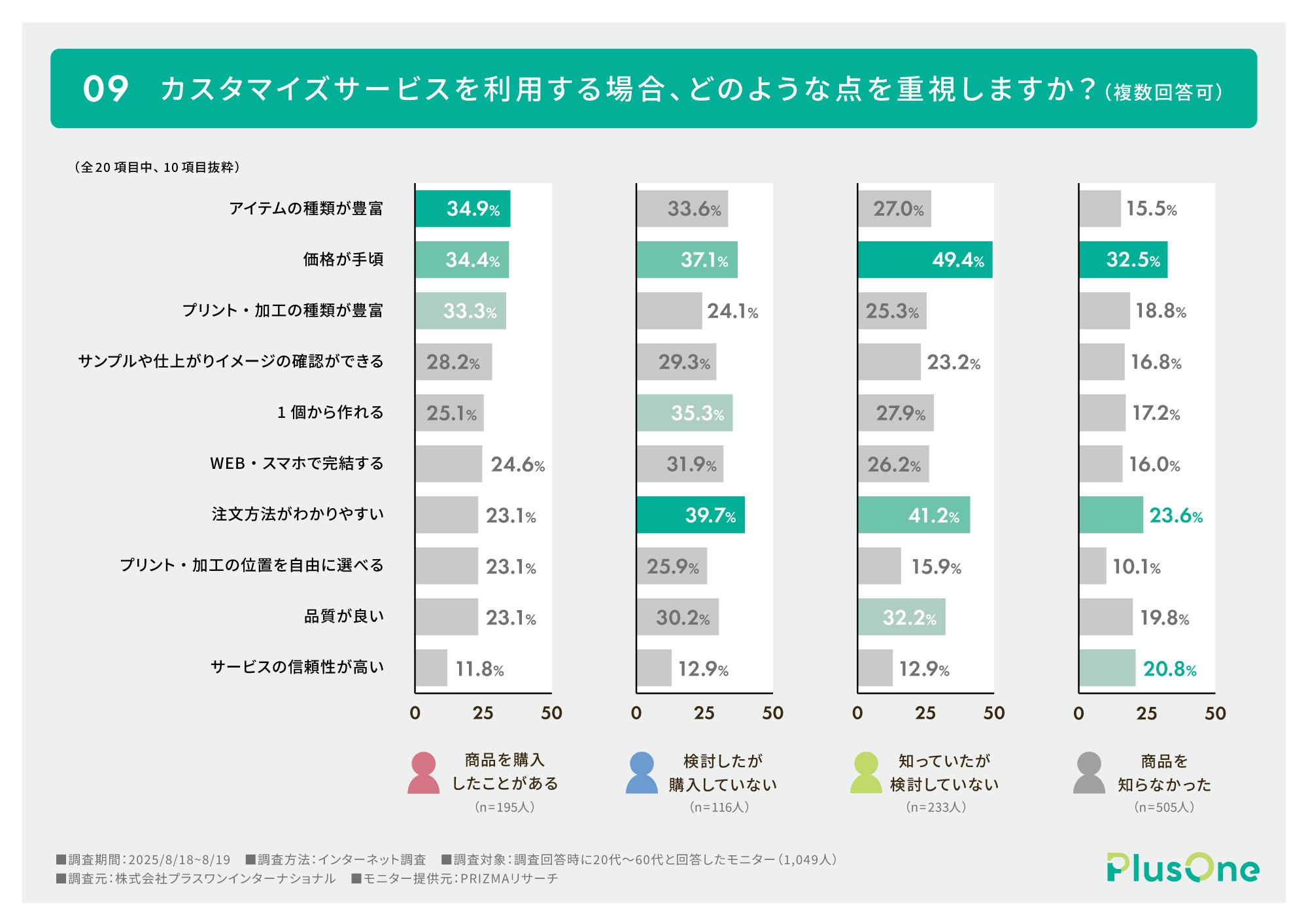 カスタマイズサービスで重視する点は、利用者経験者はアイテムや加工の種類など自由度を重視する一方、未経験者は注文方法のわかりやすさを重視する傾向が明らかになりました。