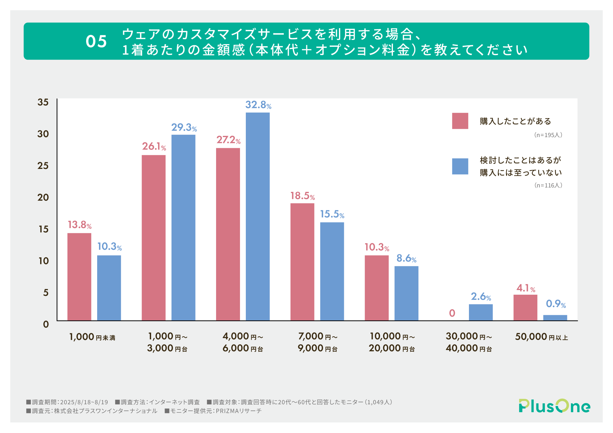 カスタマイズ商品を購入・検討したことがある方を対象に、カスタマイズできるウェアを購入する場合の1着あたりの金額感について聞いてみたところ、『4,000円〜6,000円』が最も多く、次いで『1,000円〜3,000円』と続き、購入経験の有無による金額感の差は見られませんでした。
