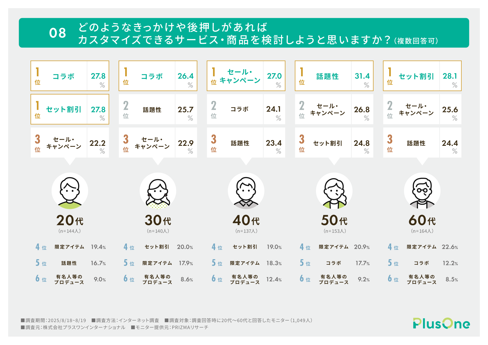 続けて、「どのようなきっかけや後押しがあればカスタマイズできるサービス・商品を検討しようと思いますか?」と質問したところ、全年代で『セール・キャンペーン』『セット割引』がきっかけとなることがわかりました。