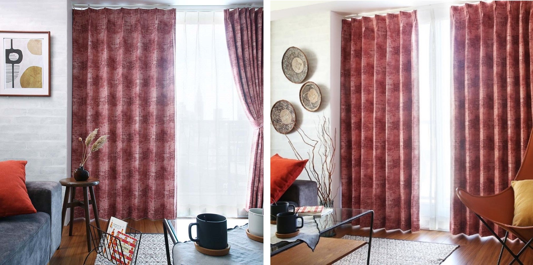 サファリカラーのくすんだコーラルがたまらなくお洒落なドレープカーテン。お部屋のアクセントにもなる独特なムードのデザインですが、以外にもナチュラルな家具との相性は抜群です。