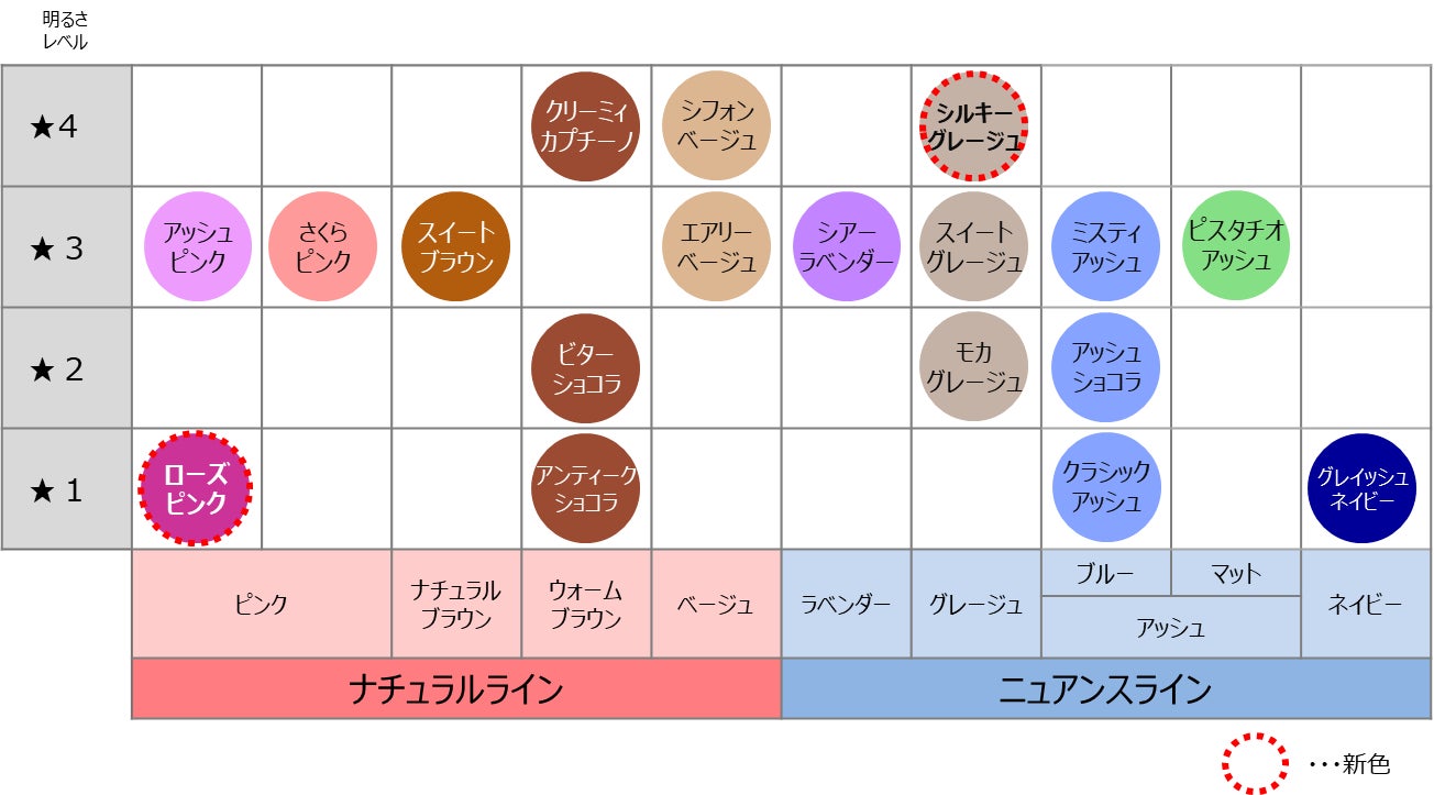 市場では高明度グレージュ・ベージュと低明度ピンクが好調です。市場で人気の色を強化し、「ニュアンスライン」に『シルキーグレージュ』、「ナチュラルライン」に『ローズピンク』を加えて、全18色のカラーバリエーションになり、引き続きおしゃれを楽しみたい女性の期待に応えていきます!