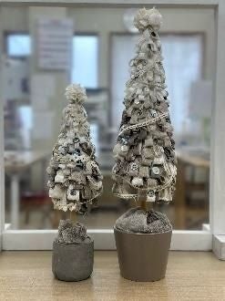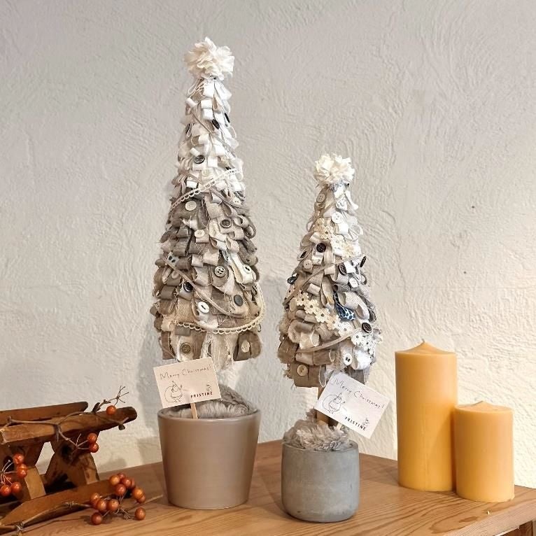 オーガニックコットンの残布やボタンやレースといった装飾パーツもあしらった2023年のクリスマスツリー。 一つ一つ心を込めて丁寧に。今年もかわいらしいクリスマスツリーが完成しました。本アイテムは、障がいのある方々が作業する福祉事業所「地域作業所hana」でのものづくりです。