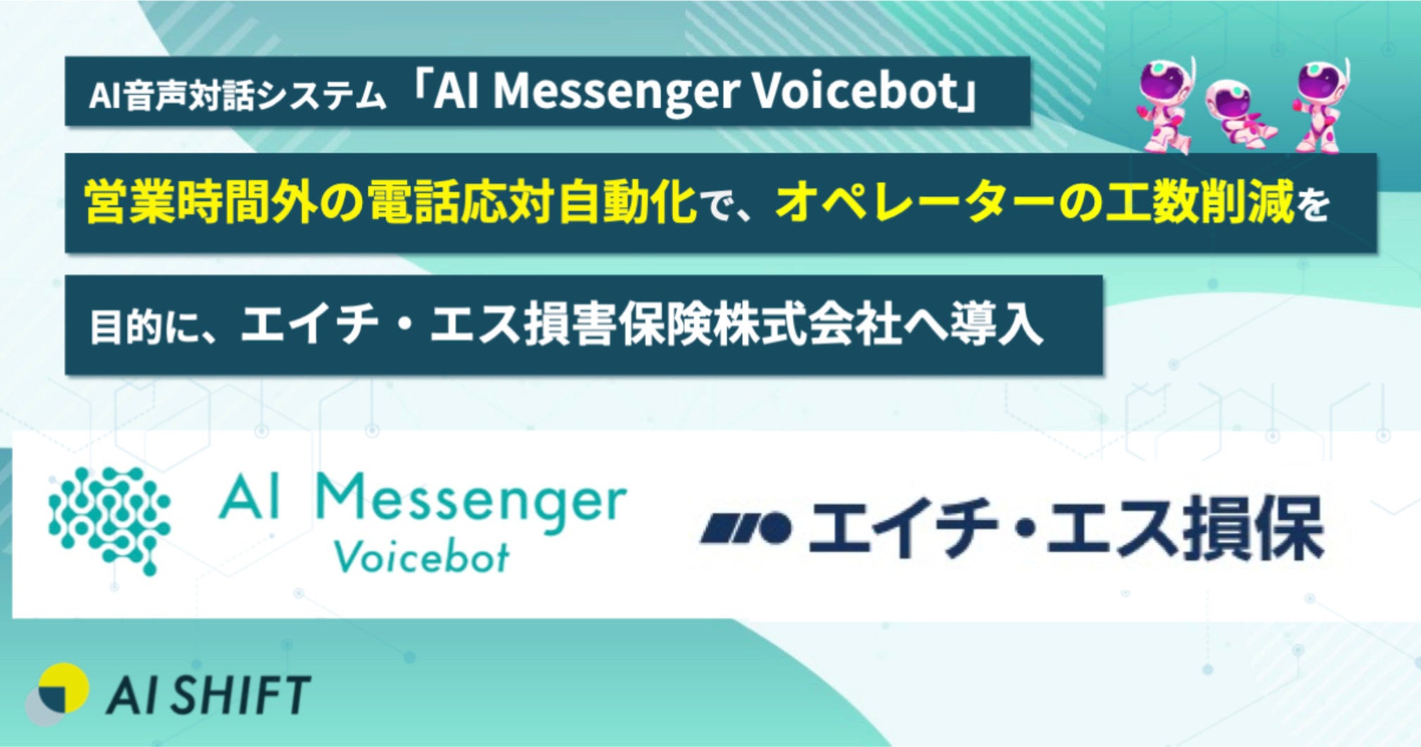 AI対話カンパニーとして対話のDXを推進する株式会社AI Shift(本社:東京都渋谷区、代表取締役社長:米山 結人)は、AI自動音声対話システム「AI Messenger Voicebot」がオペレーターの工数削減を目的として、エイチ・エス損害保険株式会社(本社:東京都中央区、代表取締役社長:楠原成基、以下、HS損保)に導入されたことをお知らせします。
