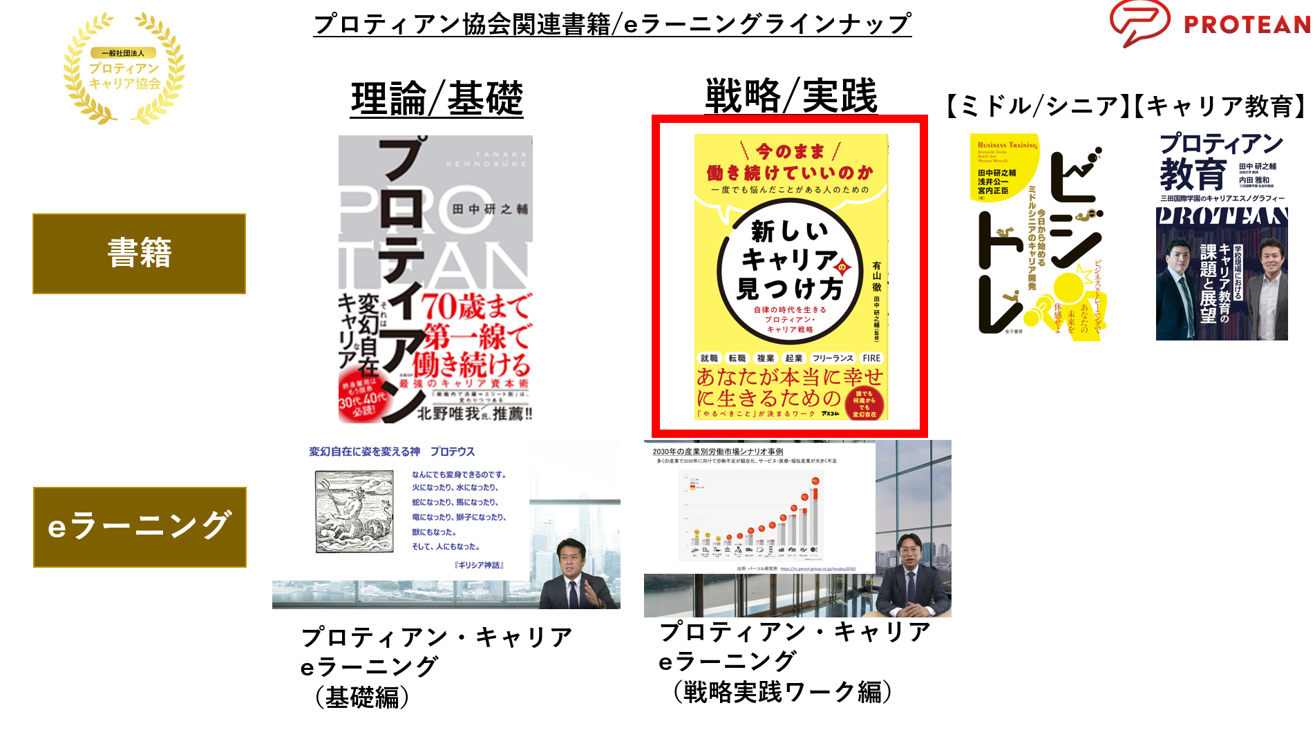 当協会が社会に拡げている「プロティアン」(田中研之輔著)をベースにしたキャリア開発支援サービスであるプロティアン・キャリア戦略塾における事例等も用いて、100年時代、VUCA時代の自律的なキャリア戦略の実践について初心者にもわかりやすく伝えるべく出版致します。
