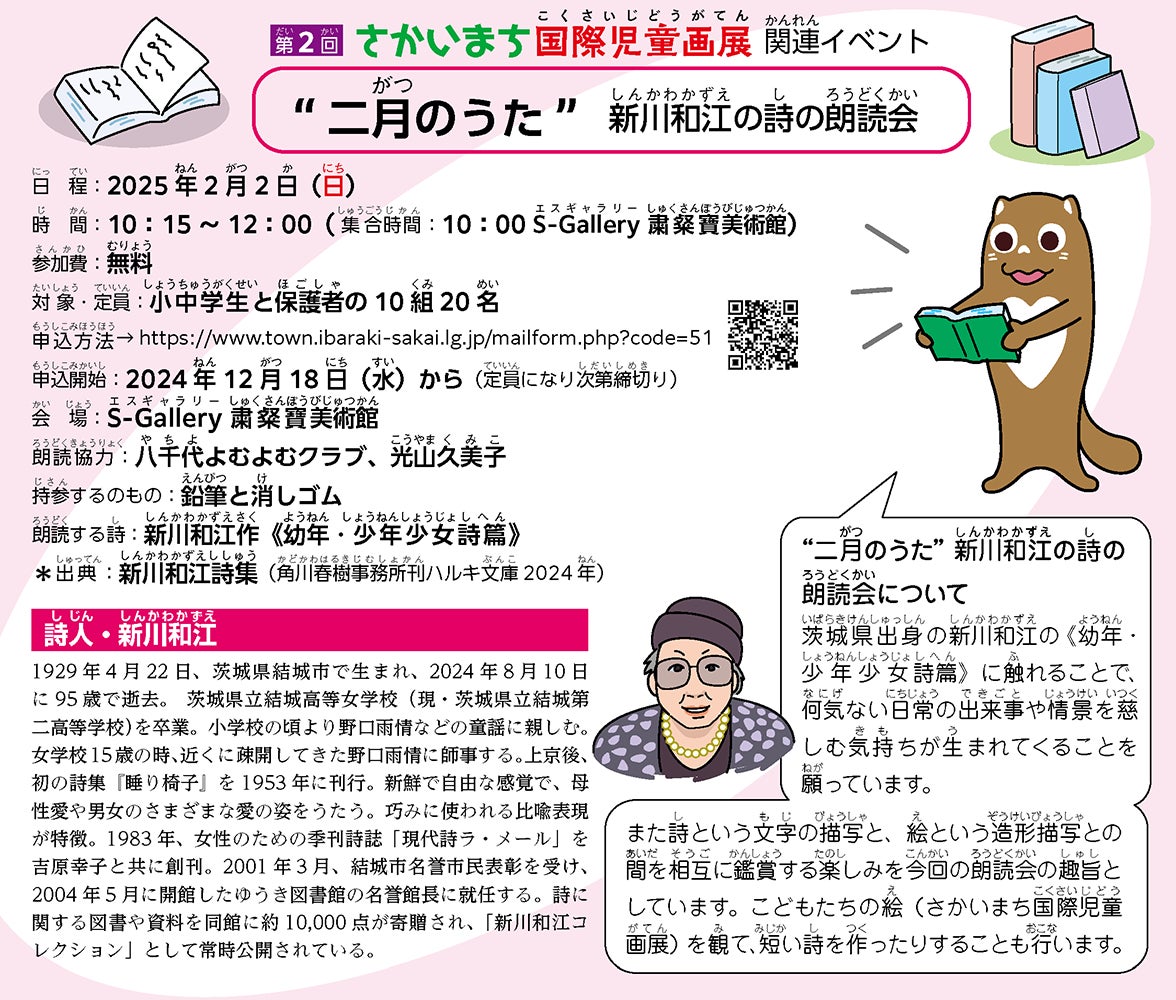 2024年12月18日から開催中の「第2回さかいまち国際児童画展」において、茨城県出身の詩人・新川和江の詩集「幼年・少年少女詩篇」の朗読会を開催します。先着10組20名、参加費無料です。