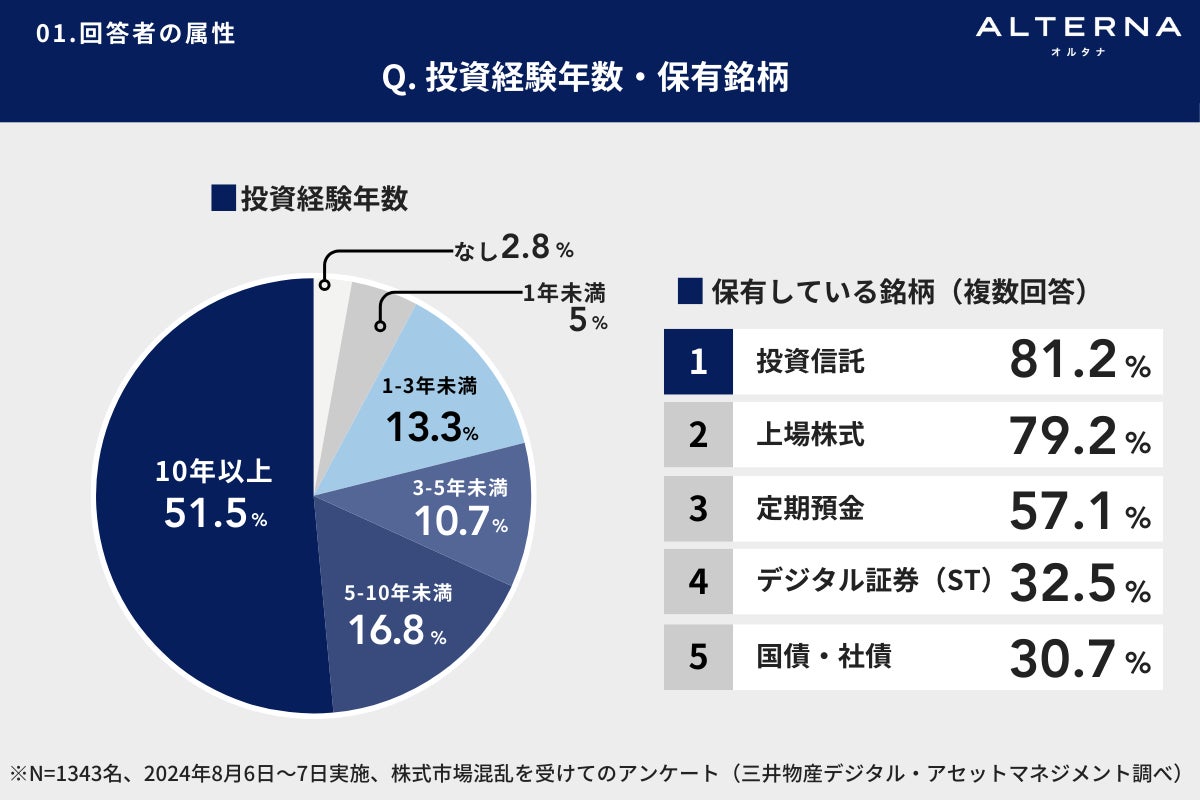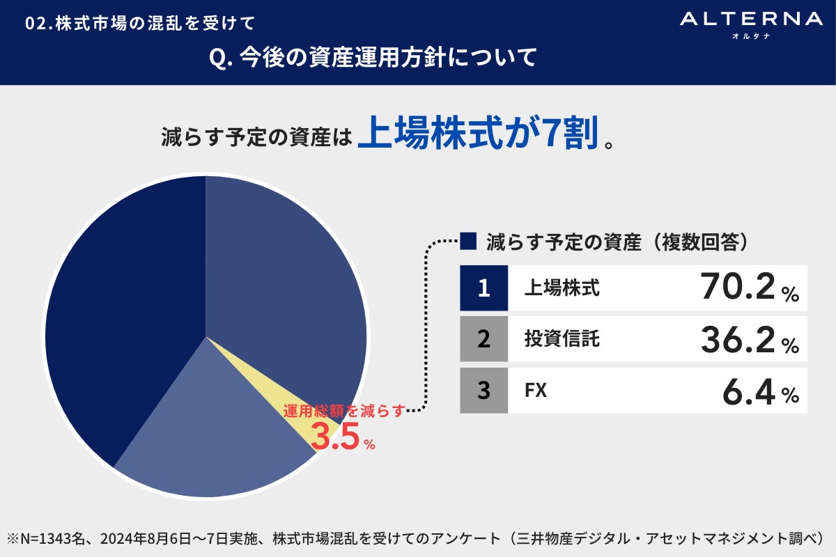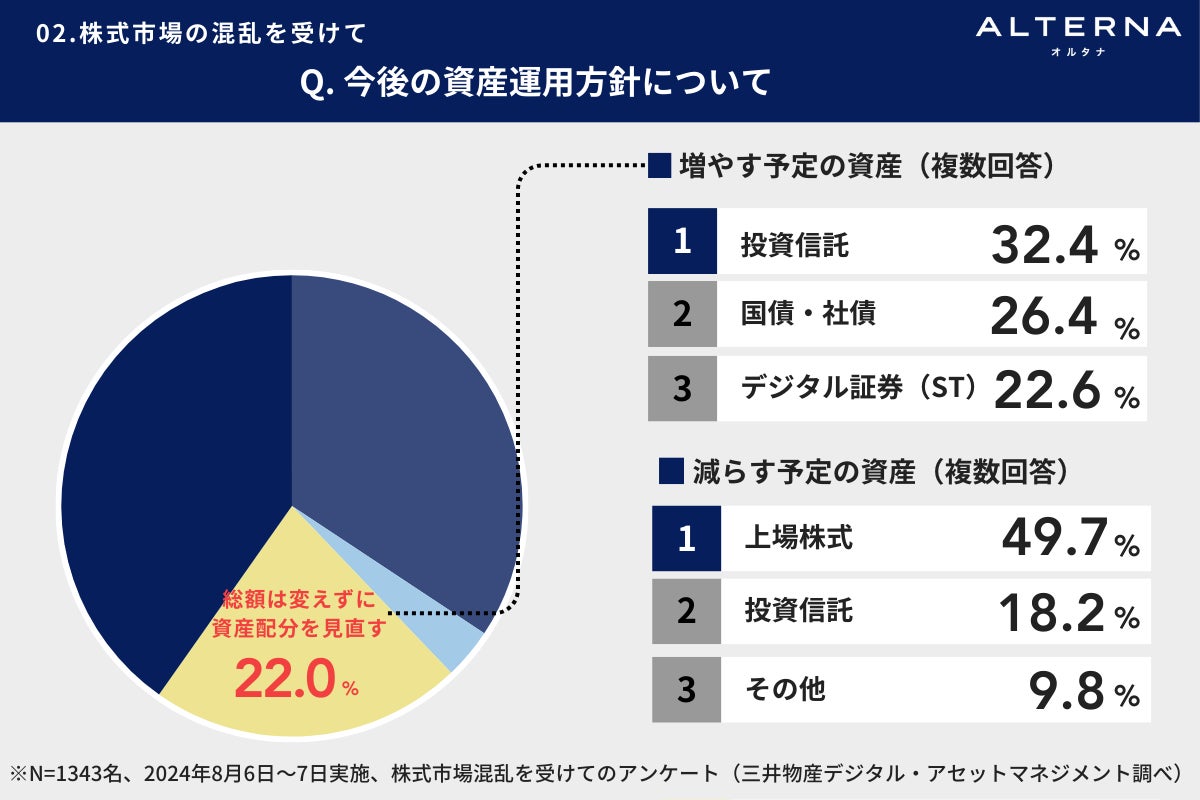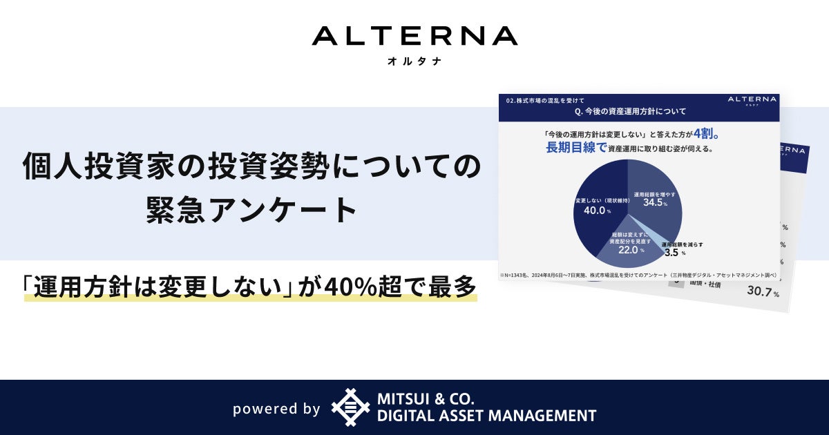 デジタル証券を活用した安定資産投資サービス「ALTERNA(オルタナ)」を提供する三井物産デジタル・アセットマネジメント株式会社(以下「当社」)は、先週からの株式市場や為替等の大幅な変動を受け、個人投資家における投資姿勢についてアンケートを実施しましたのでお知らせします。