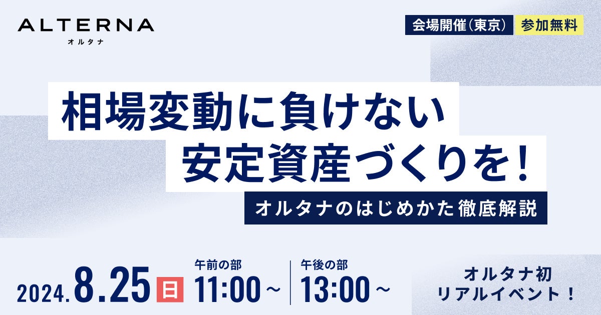 オルタナでは、直近の市場動向や、安定資産(※)を構築するためのオルタナの活用法などをご紹介する当社主催初のリアルイベントを開催いたします。