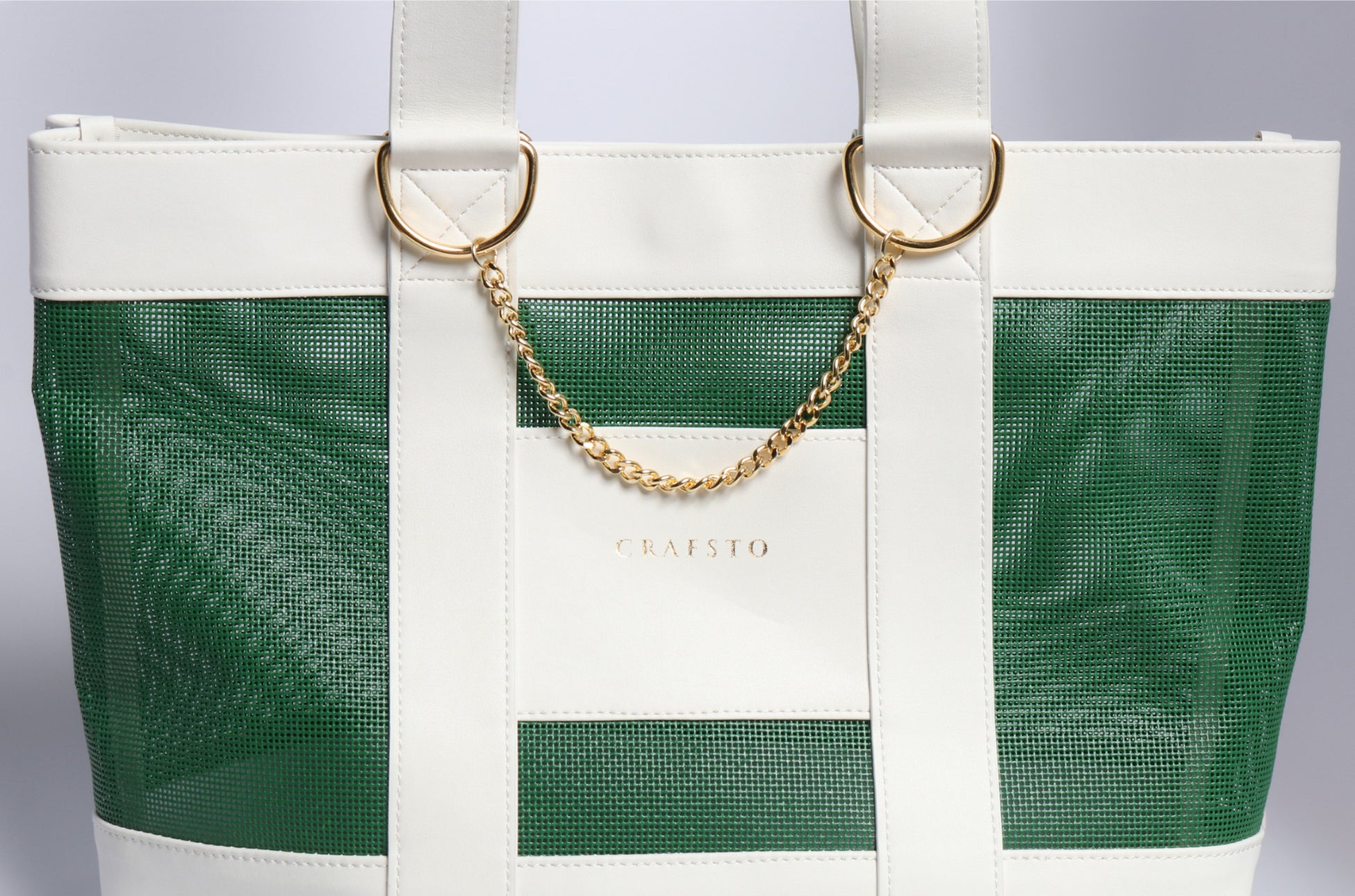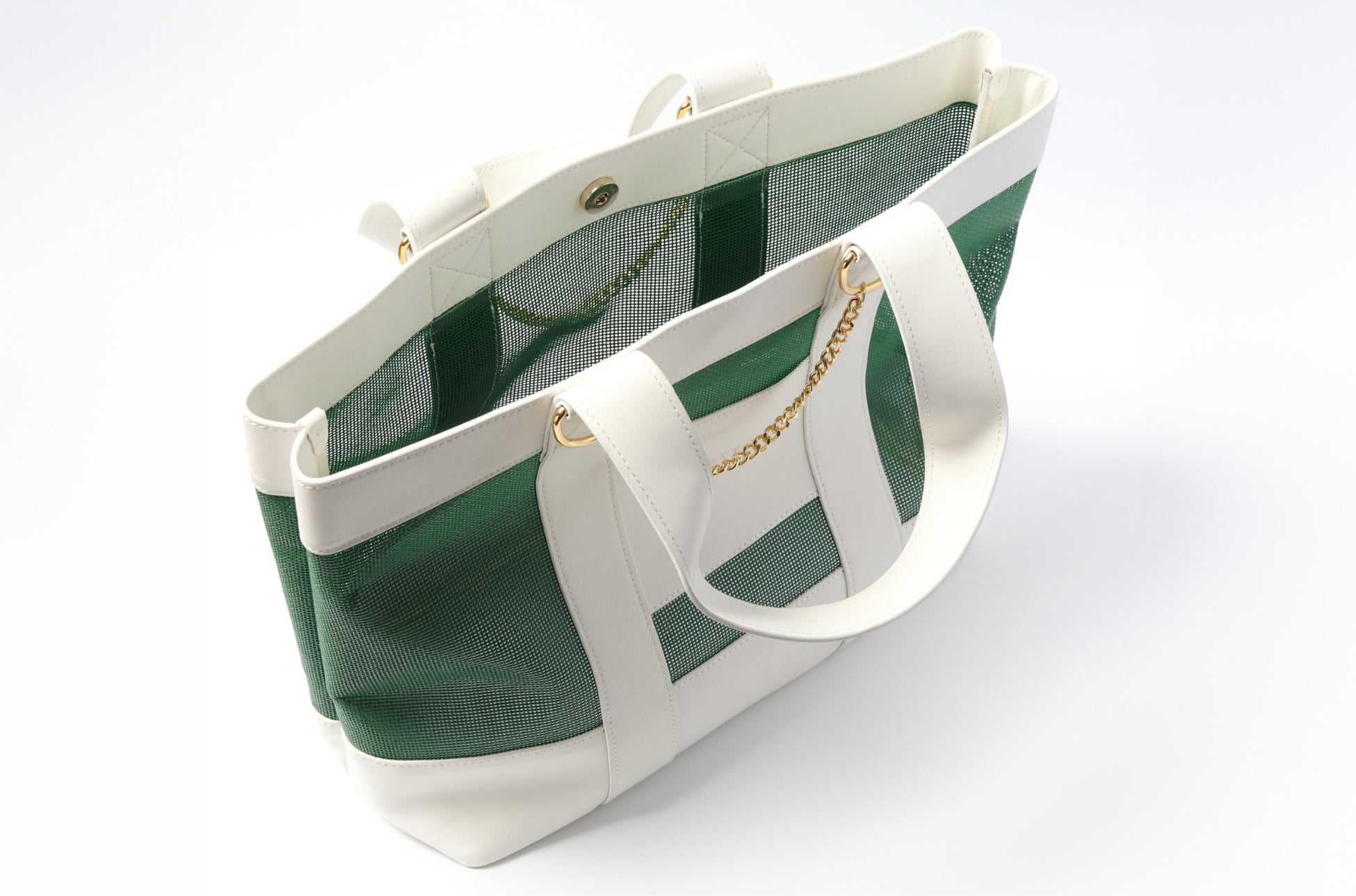外観に使用したのは、メキシコ産の植物性由来レザーDesserto(デセルト)と、厚手で高い強度・耐久性を誇るメッシュ素材(ターポリン)。レザー部分、メッシュ素材部分共に水に強く、ビーチやプールサイドに持っていくバッグとしても使用の幅が広がります。通常は汚れが気になるホワイトレザーを選んだ際にも、サボテン由来原料のレザーのため中性洗剤で汚れを落とすことが可能。この機会に、普段は選ばない色をお選びいただく事もおすすめです。