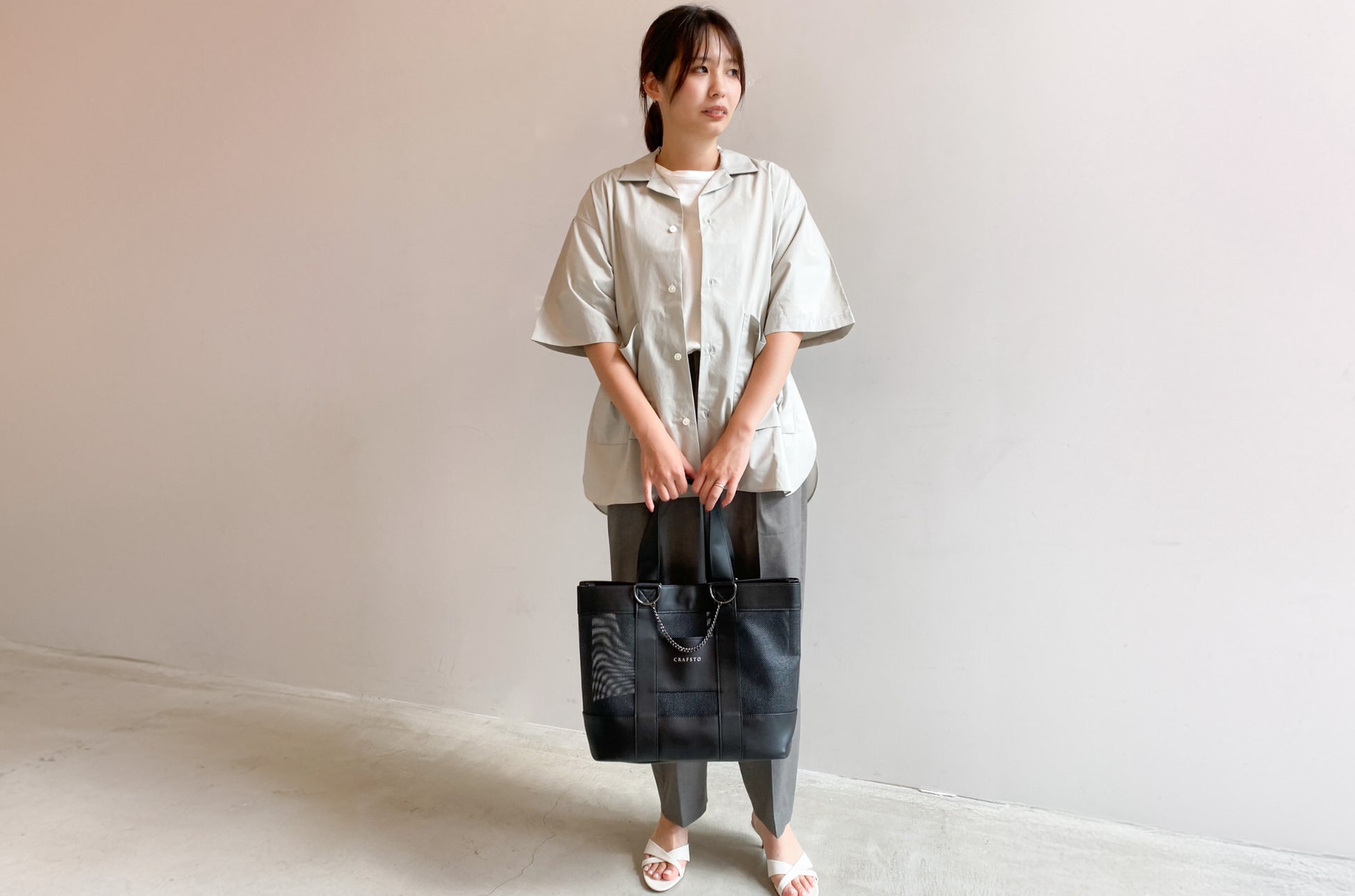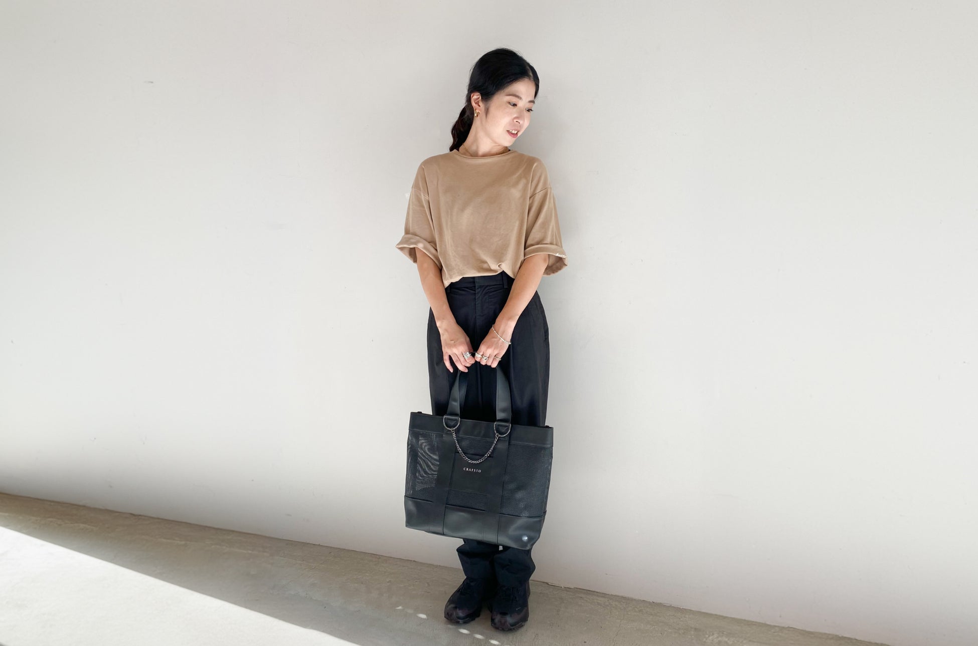新サイズとして登場したMサイズの利点はPCやA4サイズ書類が収納可能でありながらも、よりコンパクトに軽量であること。トートバッグは既に持っているけれど、普段とは違う新鮮味を求めている人にも、植物性由来レザーDesserto×メッシュ(ターポリン)の異素材使いはおすすめです。