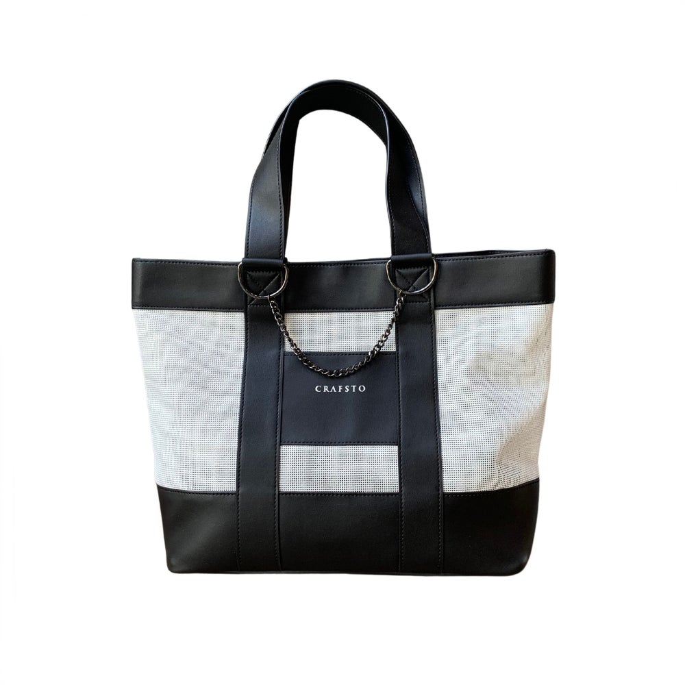 夏のリゾートバッグとしても、普段のワードローブに合わせる定番バッグとしても役立つ人気のメッシュ×Desserto ヴィーガンレザーリゾートバッグ。
