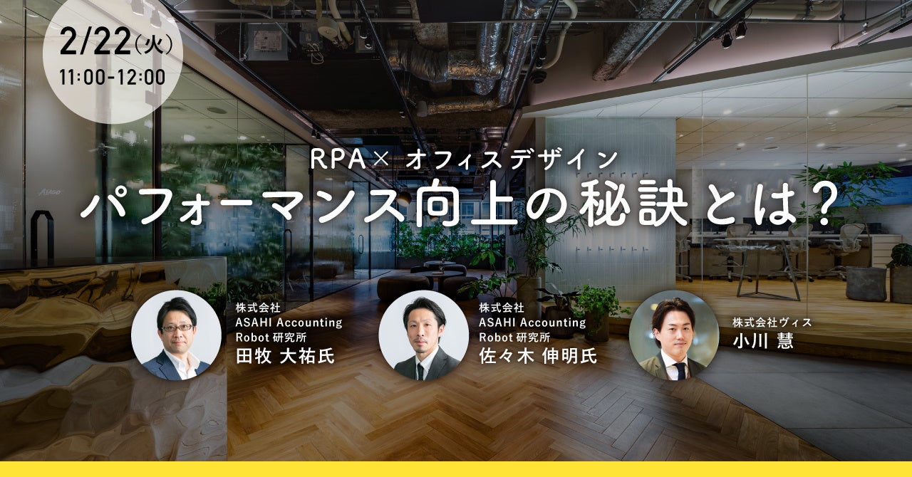 デザイナーズオフィス事業を手がけ、「はたらく」をデザインする株式会社ヴィス(本社:大阪市北区、代表取締役社長:中村勇人)は、2022年2月22日に、株式会社ASAHI Accounting Robot研究所と共催で「RPA×オフィスデザイン」をテーマとする無料オンラインセミナーを開催します。