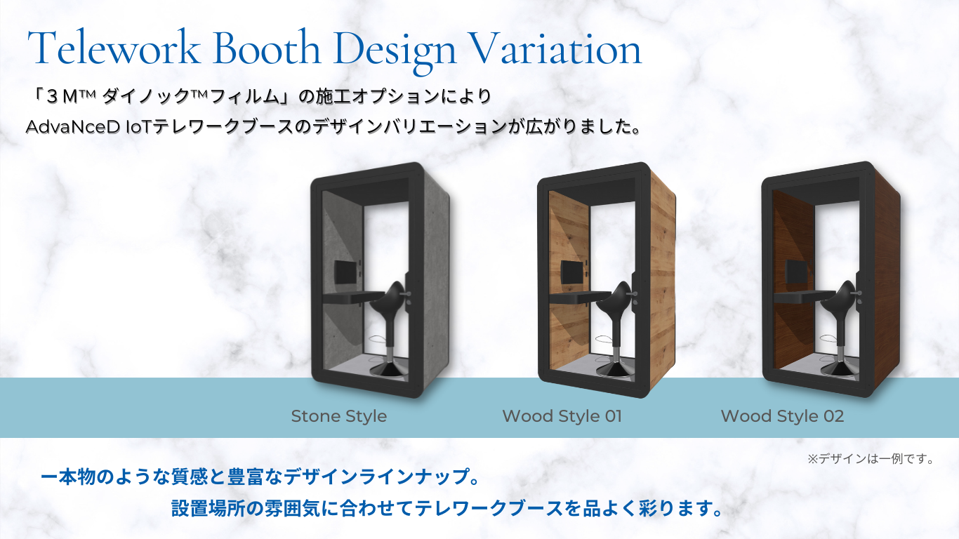 テレワークブースのデザインバリエーションがさらに豊富に!「AdvaNceD IoTテレワークブース」のオプション「3M™ ダイノック™フィルム施工」が新登場