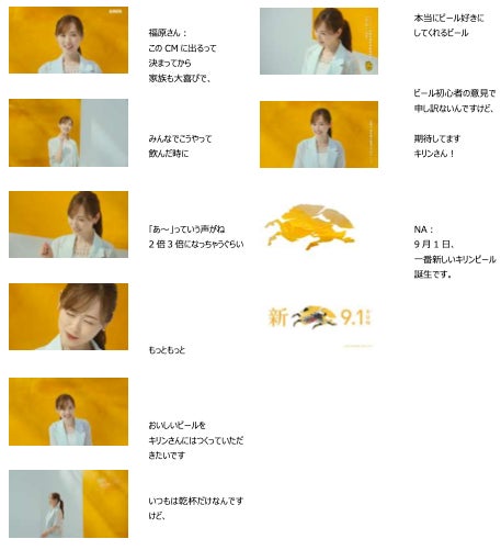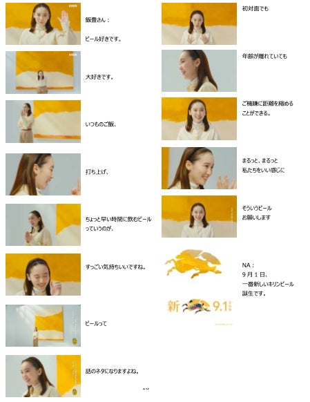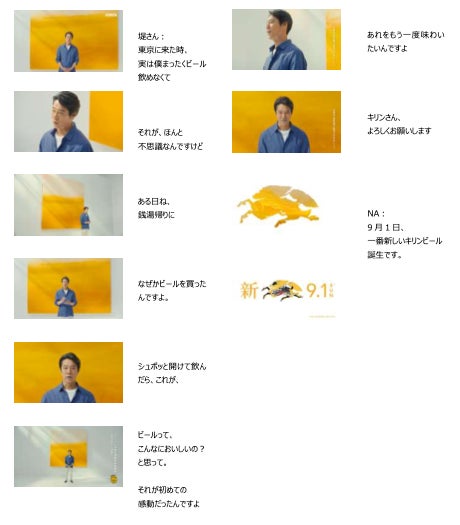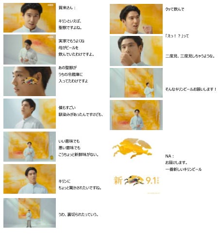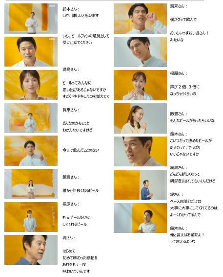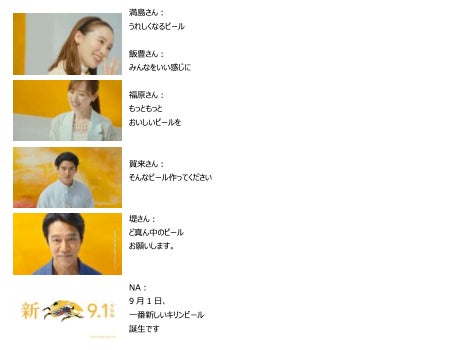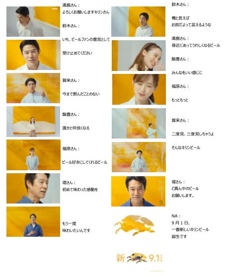 今回の新CMでは、ビールが本当においしくなってほしいと願う6人のキャストが、ビールを想起させる抽象画をバックに登場。堤さんが「あれをもう一度味わいたいんですよね」「キリンさん、お願いします」と新しいビールへの期待を率直に語ると、家族や友人とのビールにまつわる思い出を楽しそうに語る満島さんは「思い出を思い出しただけであたたかくなるビール」をリクエスト。さらに、「いつものなんだけれどなんか新しい、変化球じゃないビール」(鈴木さん)、「あ~っていう声がね、 2倍3倍になっちゃうくらいもっともっとおいしいビール」(福原さん)、「まるっとまるっと私たちをいい感じにしてくれるビール」(飯豊さん)、「二度見三度見しちゃうようなビール」(賀来さん)と、6人それぞれが自分の言葉でビールへの思いを綴るシーンを通じて、「9月1日、一番新しいキリンビール誕生です。」というメッセージを印象的に訴求していきます。