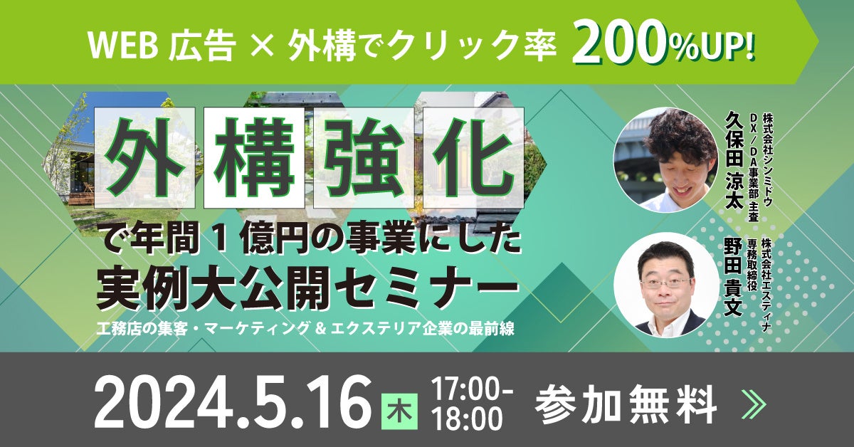 株式会社シンミドウ(本社:埼玉県さいたま市、代表取締役:笹田知弘)と株式会社 エスティナ(本社:東京都渋谷区、代表取締役:真崎 健)は、2024年5月16日(木)に、全国の工務店・建築事務所を対象に、【来月の集客に直結】Web広告×外構でクリック率200%UP!外構強化で1億円の事業にした実例大公開コラボセミナーを開催します。