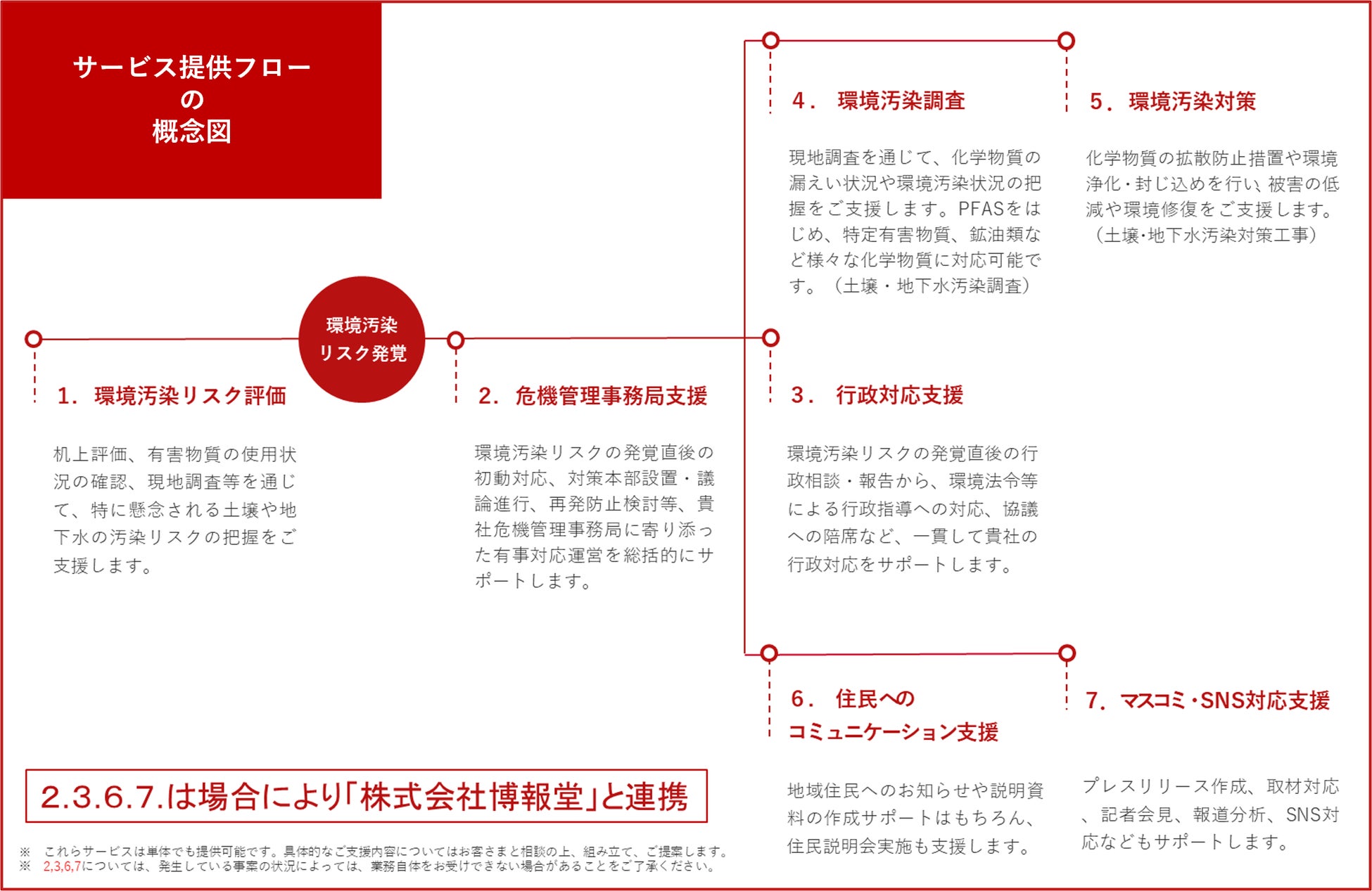 環境汚染リスクの発覚時(漏えい等事故時)は、初動対応や対応方針の策定など危機管理事務局の運営を支援します。また、漏えいによる汚染状況を把握するための調査、汚染土壌や地下水の対策工事、関係する行政との協議、プレスリリースやマスコミ・SNS対応、近隣住民とのコミュニケーションをご支援します。さらに、環境汚染リスクの発覚時は、必要に応じて株式会社博報堂と協働し、ご支援を行います。