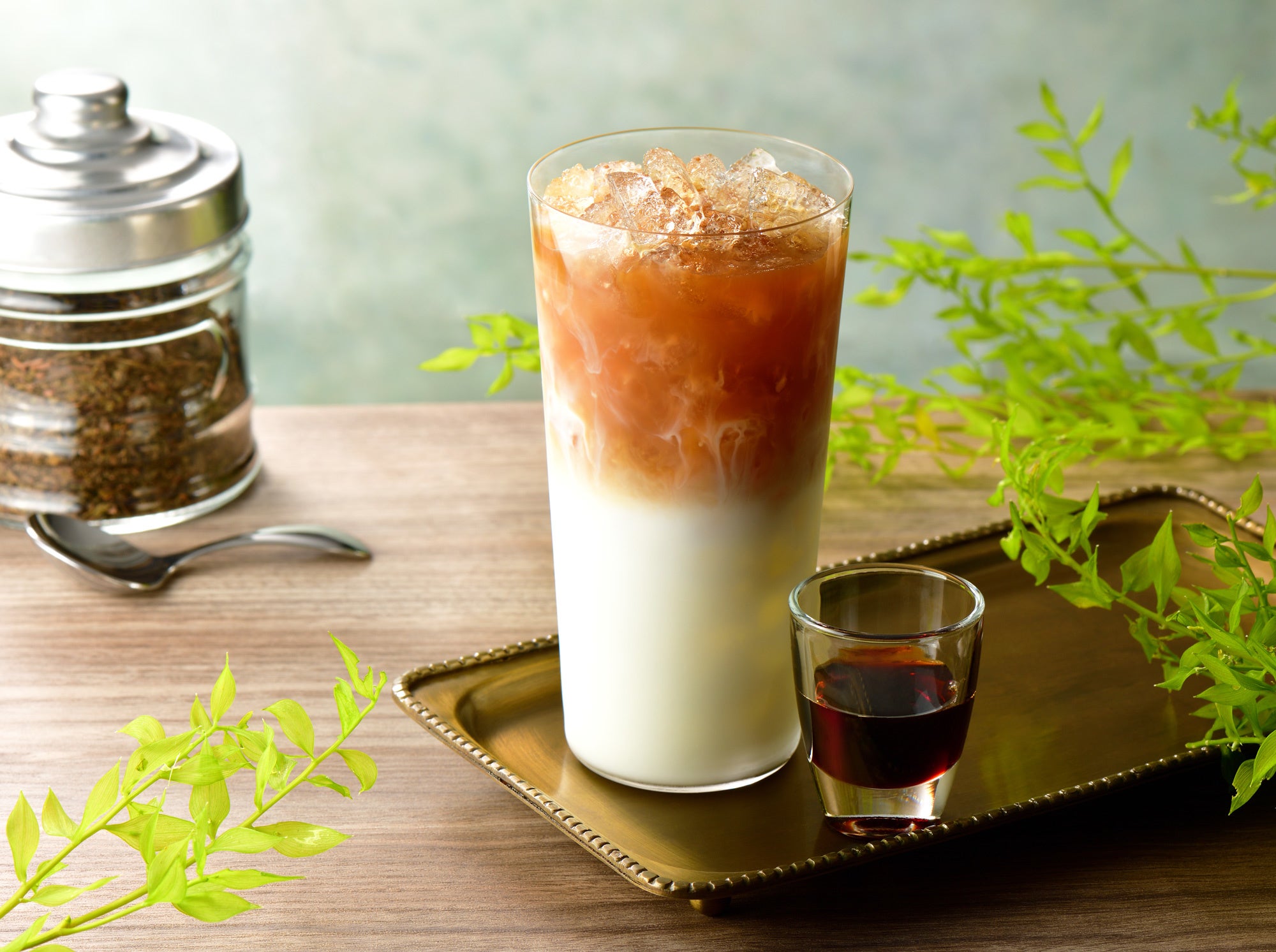 ■「アイスほうじ茶ミルクティー〜沖縄県産黒糖みつ添え〜」(手前) ¥490〜