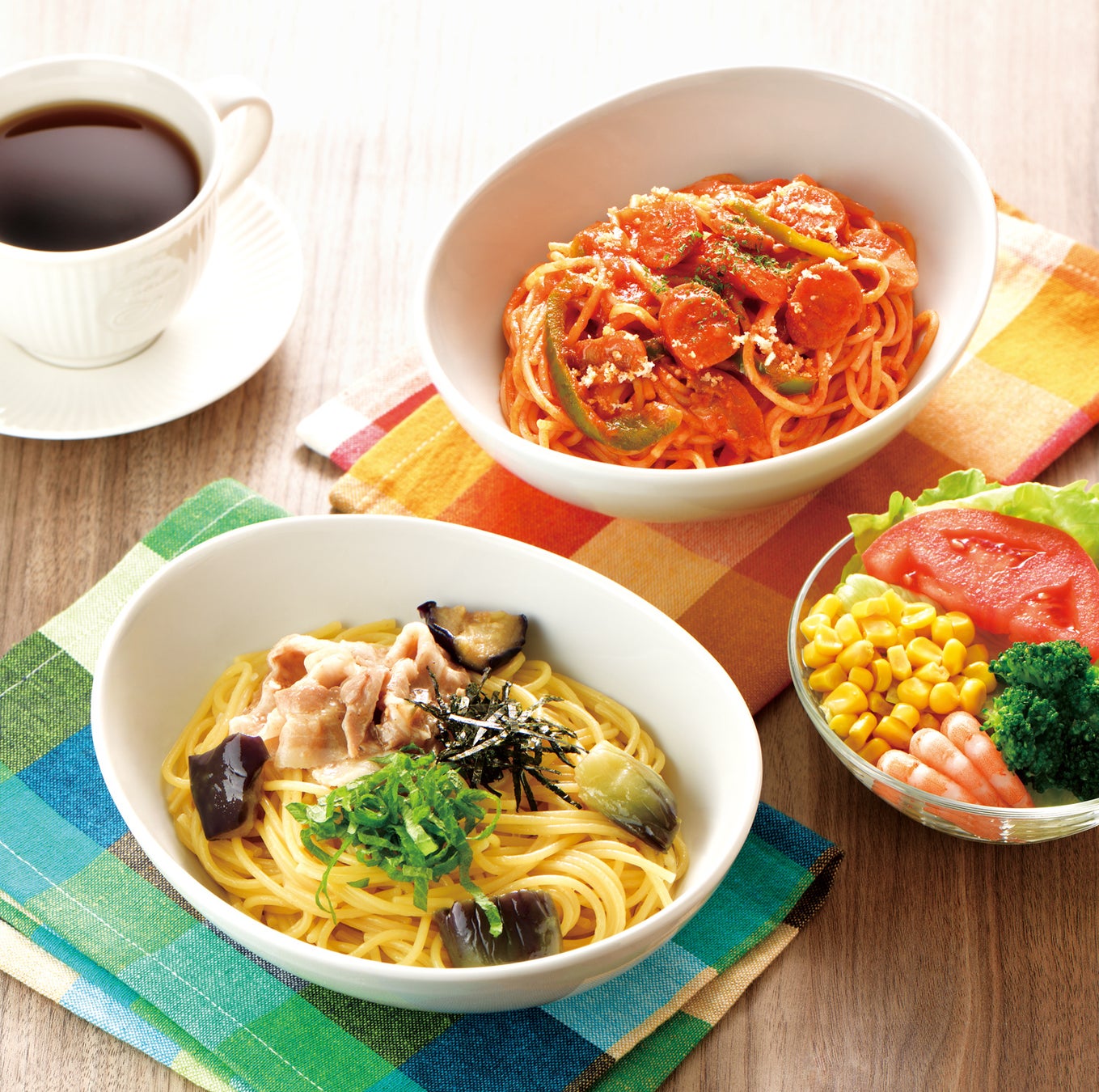 「アイスほうじ茶ミルクティー〜沖縄県産黒糖みつ添え〜」「豚しゃぶと揚げなすの和風オイルソース」「洋食屋さんのナポリタン」「レモン香るひんやりパウンドケーキ」