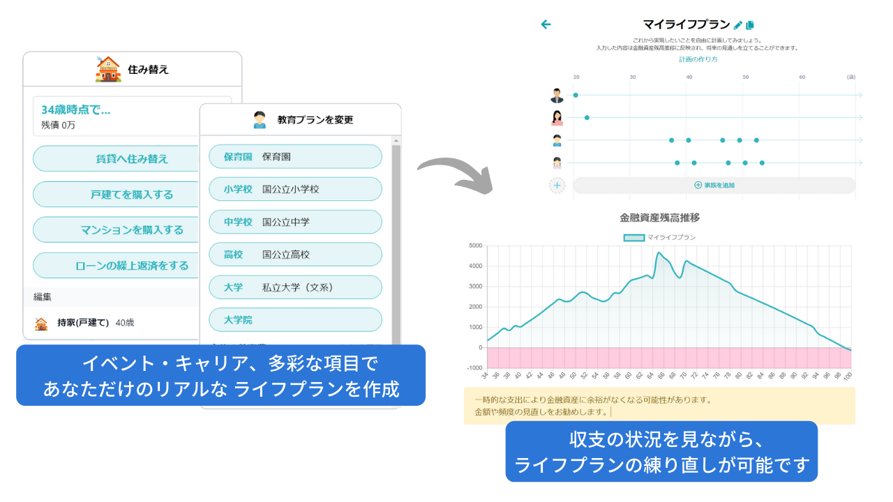 また複数パターンのプランを保存できるため、子どもが増えた場合、家を購入した場合、ご主人が転職をした場合、奥様が産休育休取得後に復帰をした場合などプランを比較しながら検討できます。保存したプランは手元に残り、ご自身でいつでも閲覧・編集ができます。