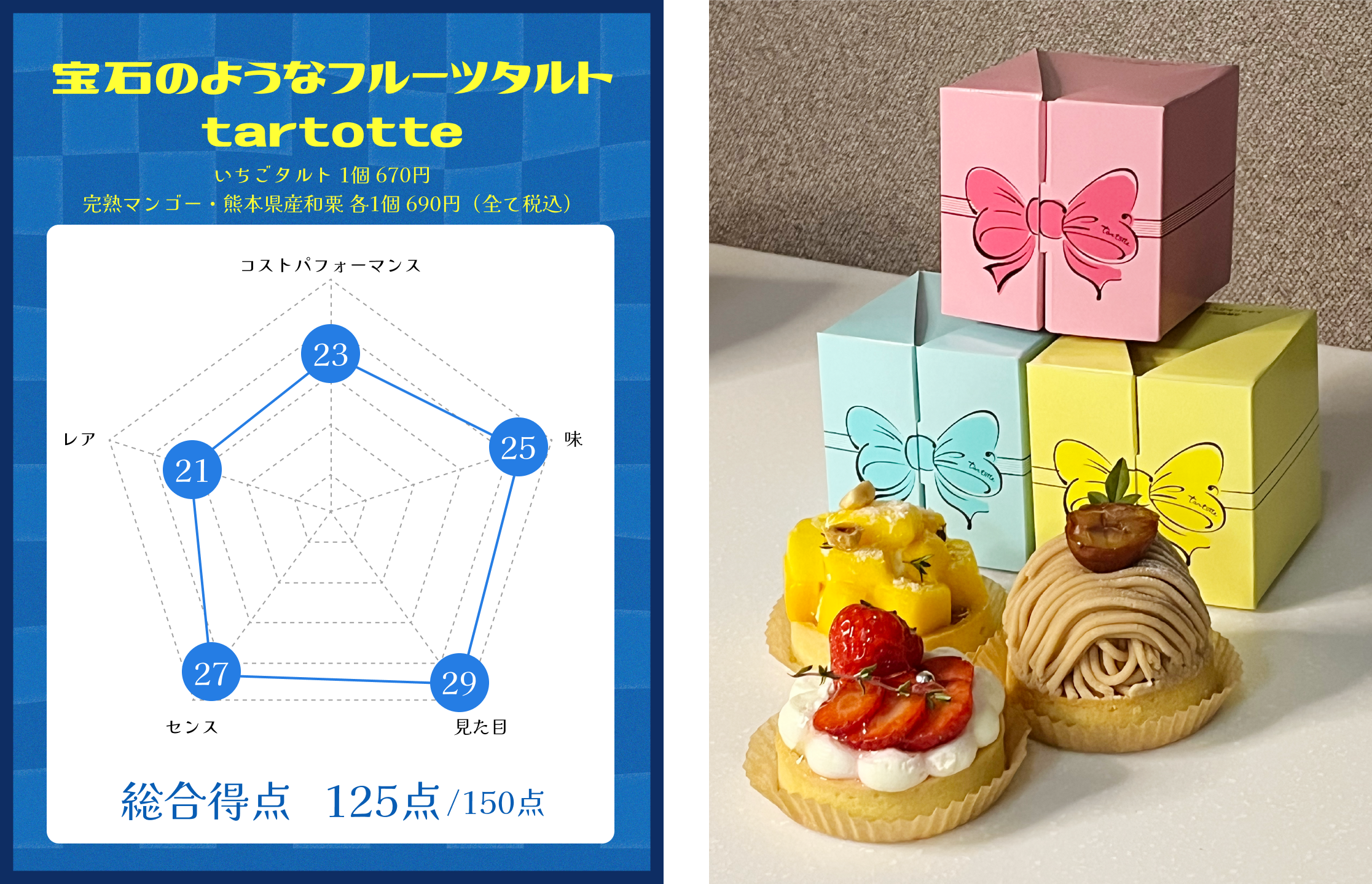 【1位】 宝石のようなフルーツタルト tartotte / いちごタルト 1個 670円、完熟マンゴー・熊本県産和栗 各1個 690円 (全て税込)