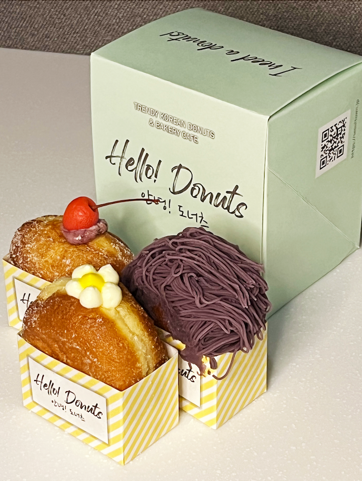 韓国ドーナツ専門店「HELLO!DONUTS」は、イラストのような可愛らしい見た目が特徴。目の前で絞り出す「紫モンブラン」は池袋パルコ店限定!