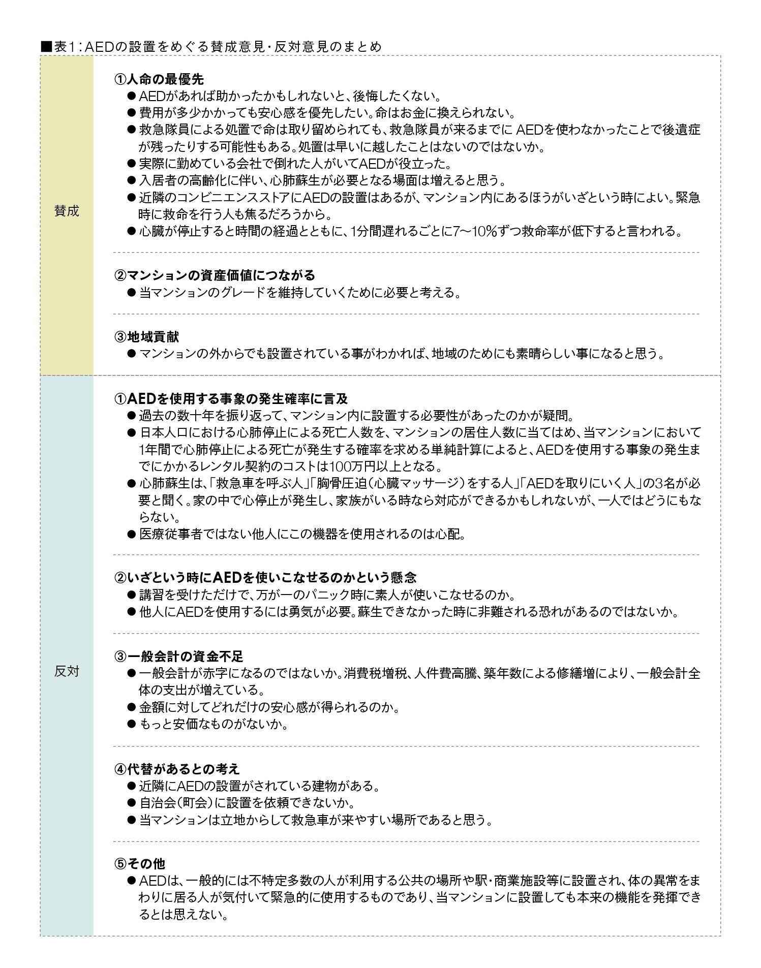 ・AED設置をめぐる議論において、賛成派の意見は主に「人命を最優先させるべきこと」を主張し、反対派の意見は主に「発生頻度に対して費用が高いこと」を指摘している。