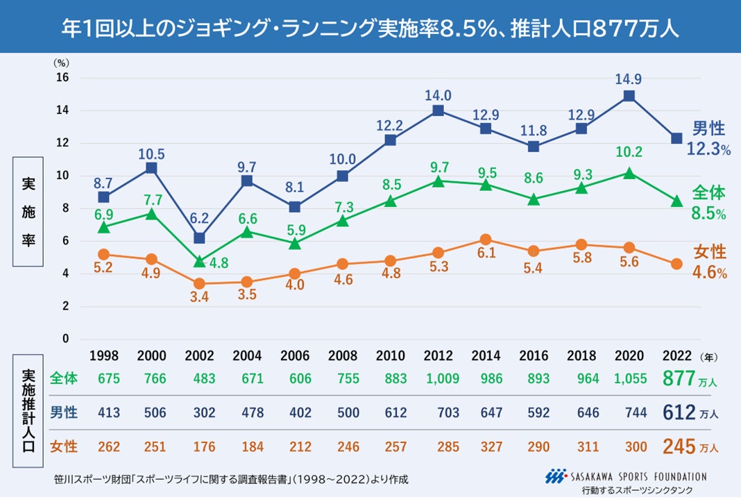 2022年のジョギング・ランニング実施率(年1回以上)8.5%、推計実施人口877万人