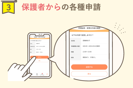 遅刻や欠席の連絡、延長などの利用時間変更、通常利用日以外での預かりのご利用、給食の申込など、保護者はアプリから各種申請が可能です。申請機能は教室の運用状況に合わせて、選択できます。各種申請は自動で入室予定に反映され、教室の手間を大幅にカットします。