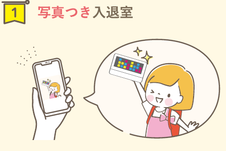 子どもたちがカードをかざすと、その時の顔写真と一緒に、保護者へ入退室メッセージを配信します。教室の雰囲気や子どもたちの様子がダイレクトに伝わり、保護者の安心感も高まります。カードをかざすだけで認識が完了。そのスピードは1人0.5秒(最速値)。運営もしやすい入退室サービスです。
