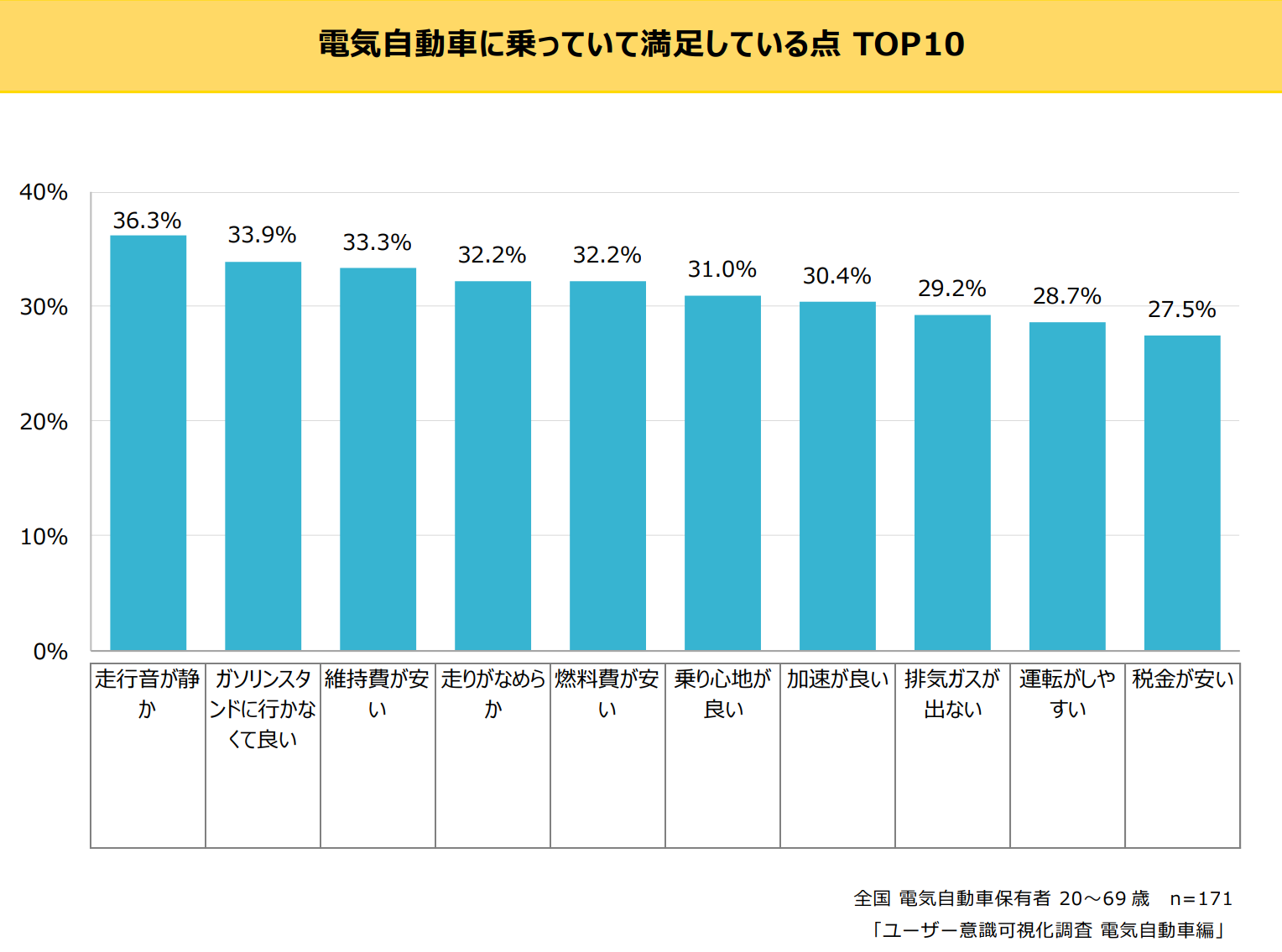 電気自動車ユーザーにきいた電気自動車に乗っていて満足している点は、上位から「走行音が静か」(36.3%)、「ガソリンスタンドに行かなくて良い」(33.9%)、「維持費が安い」(33.3%)、「走りがなめらか」「燃料費が安い」(各32.2%)という結果に。